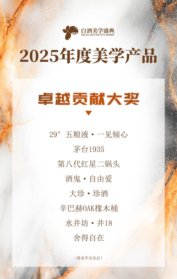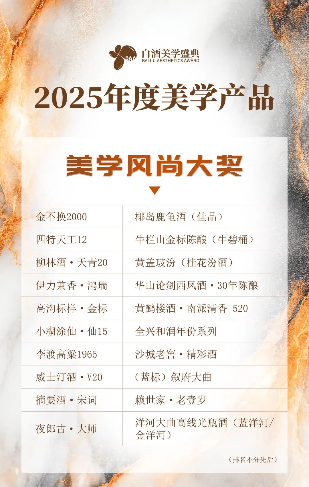 2025年度白酒美学产品设立卓越贡献大奖,旨在表彰那些具有行业意义的创新产品,它们在白酒低度化、渠道创新、模式创新等方面对行业发展具有引领作用,获奖名单如下: