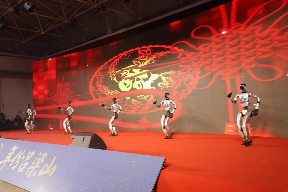 “酒有风骨,文有韵致”,著名朗诵艺术家周联盟登台演绎《吕梁山酒赋》。他以铿锵有力的语调,将吕梁的山川风骨、红色基因与酒文化底蕴融入字里行间,“英雄以酒壮志,贤才以酒成篇”的豪情,“以清风汇清香,日明月朗;以清心汇清流,地久天长”的意境,让现场嘉宾沉浸在“酒与山河”的文化盛宴中。随后,赛玻宇树机器人表演团带来《福星高照》表演,机器人转身、托举的动作中暗藏“酿酒翻曲”“酒坛堆叠”的灵感,将传统工艺与现代科技巧妙融合,赢得满堂喝彩。《英雄酒舞》的登场则将氛围推向高潮,演员们的跳跃如酒液流转,鼓点起落似酒坛轻叩,以艺术形式演绎酒文化的敬、礼、雅,展现吕梁山酒的豪迈与典雅。