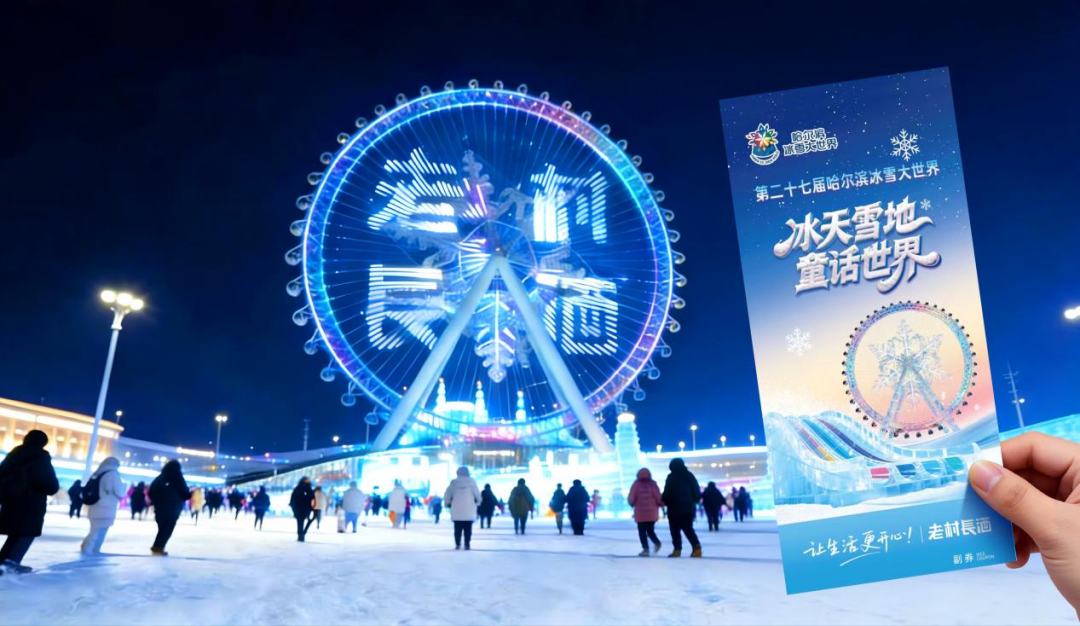 开园首日,冰雪大世界客流量便达4.5万人次,再创新高。面对持续攀升的人气与全国游客的热切关注,老村长酒以更贴近消费者的互动形式融入这场冰雪狂欢,将品牌曝光自然融入游客赏冰玩雪的全过程。从入园凭证上的品牌印记,到售票大厅的主题展示矩阵,再到大滑梯等候区的互动展位、摩天轮灯光秀中的品牌亮相等多元场景,老村长酒全程快乐相随。