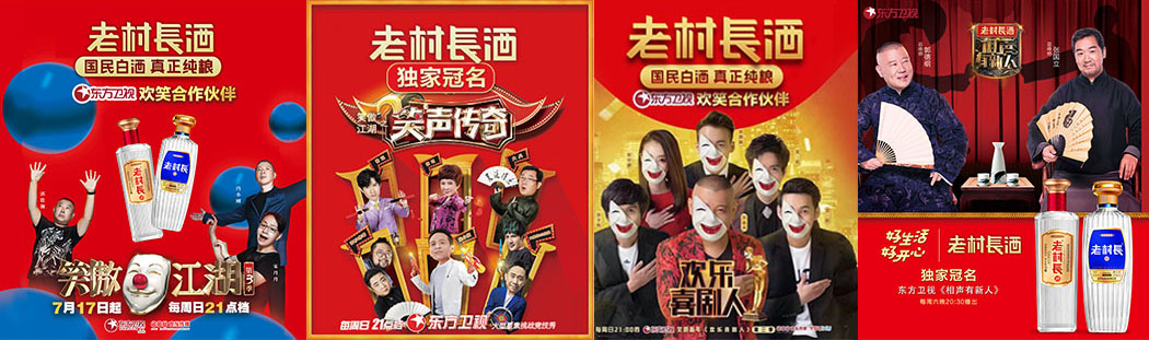 回顾其品牌合作轨迹,老村长酒与“快乐”的关联建构具有清晰的延续性与递进性。从2016年开始和东方卫视系列喜剧综艺合作以来,老村长酒逐渐建立起与“快乐”的关联。自此,《笑傲江湖》《笑声传奇》《欢乐喜剧人》《相声有新人》《欢乐中国人》等喜剧栏目,都有老村长酒的身影。
