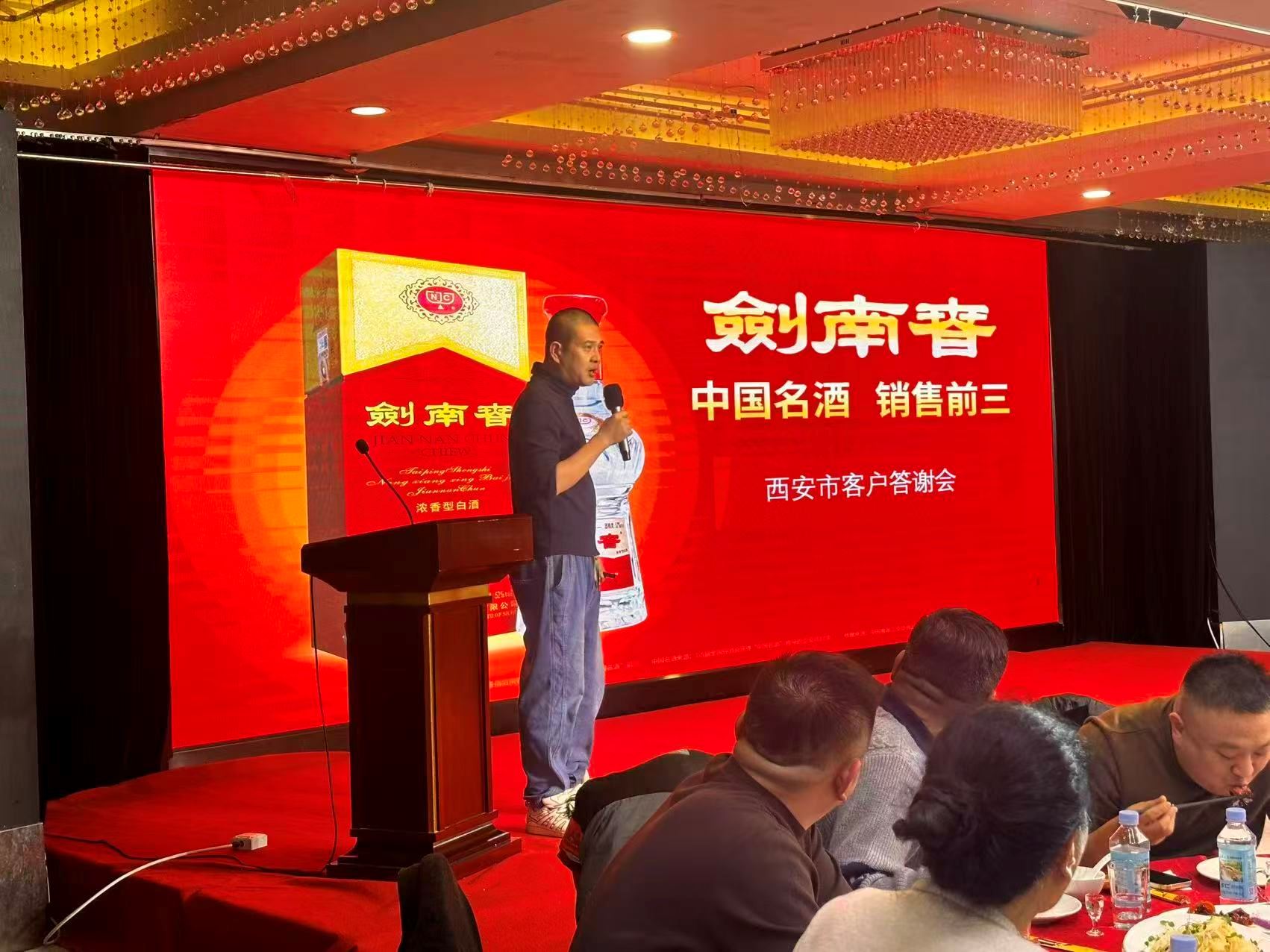 答谢会在欢快的舞蹈表演中拉开帷幕。四川绵竹剑南春酒厂西安绵竹办事处主任张国虎首先登台,向与会嘉宾详细介绍了剑南老窖的品牌优势和品质特色。他着重强调了剑南老窖"千年老窖酿美酒"的文化底蕴,指出这是品牌最具辨识度的核心价值。在产品策略方面,张国虎表示剑南老窖将持续深耕100-300元价格带,打造长线产品,为经销商提供稳定的利润空间和市场支持。