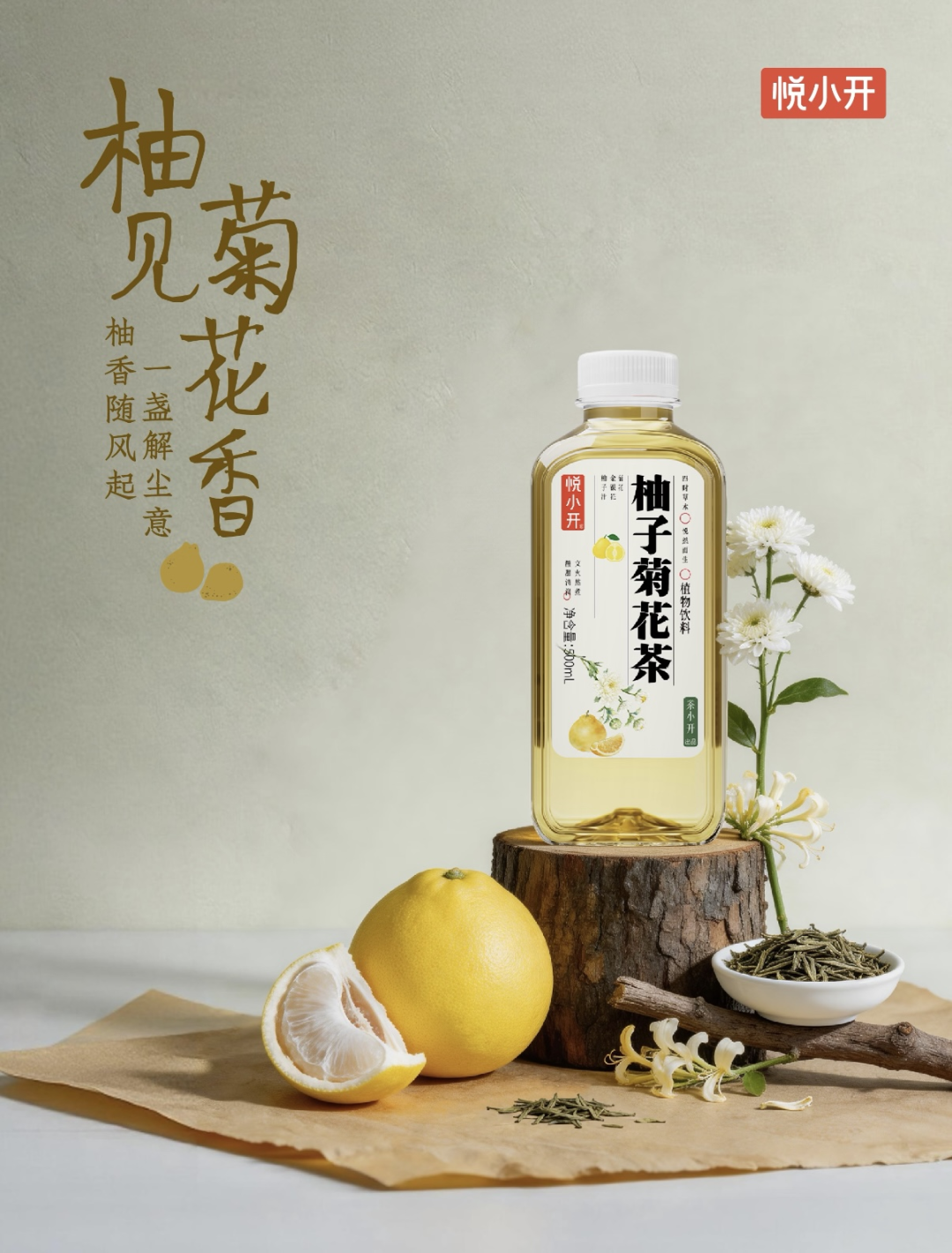 产品主打鲜柚清香,菊花回甘,入口是清,回味是润。