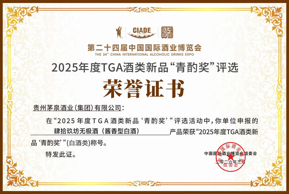 作为本届酒博会核心同期活动之一的“2025年度TGA酒类新品‘青酌奖’”评选活动的结果正式揭晓。肆拾玖坊申报的肆拾玖坊无极酒(酱香型白酒)凭借卓越品质,从全国上百款参评白酒产品中脱颖而出,成功斩获“2025年度TGA酒类新品‘青酌奖’”(白酒类)称号。这是肆拾玖坊成立十一周年之际收获的又一份行业殊荣,也是对品牌坚守“酿造纯粮好酒”初心的权威认可。
