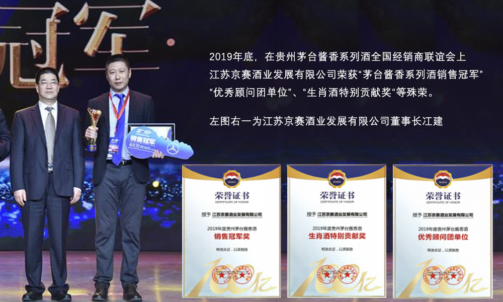 专业创造未来。京赛酒业本着“言行合一,创造美好”的核心价值观,坚持做品质的坚守者、行业创新的突破者。2019年,公司荣获茅台酱香系列酒销售冠军、优秀顾问团单位、生肖酒特别贡献奖等殊荣。