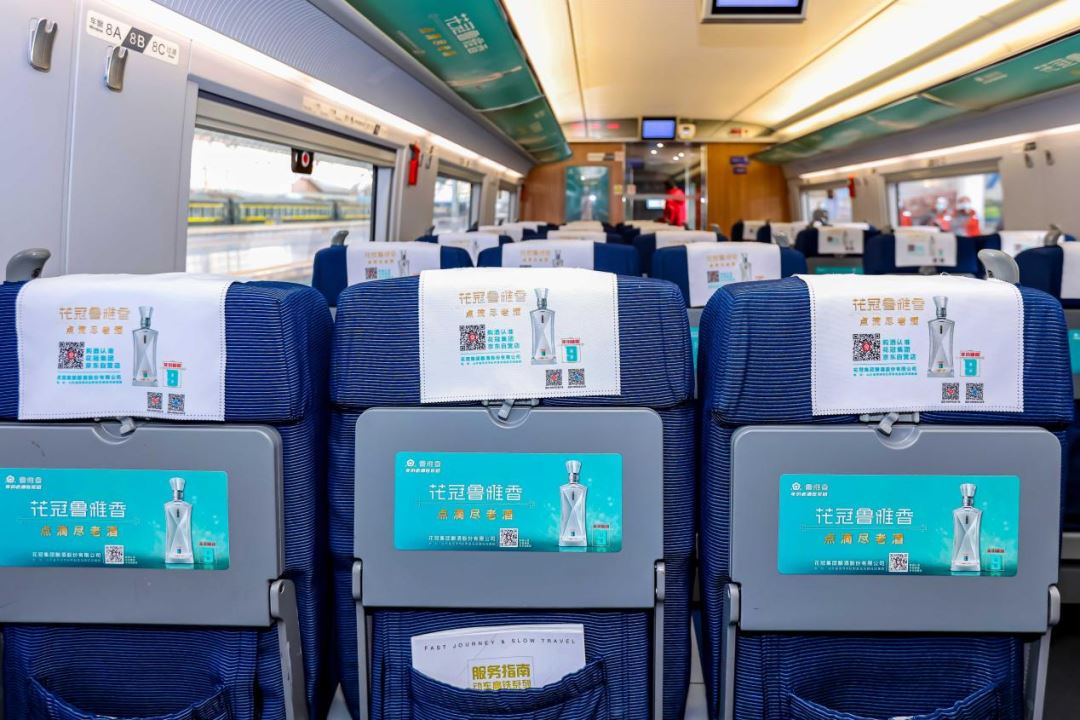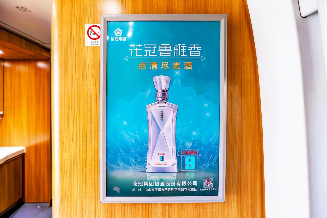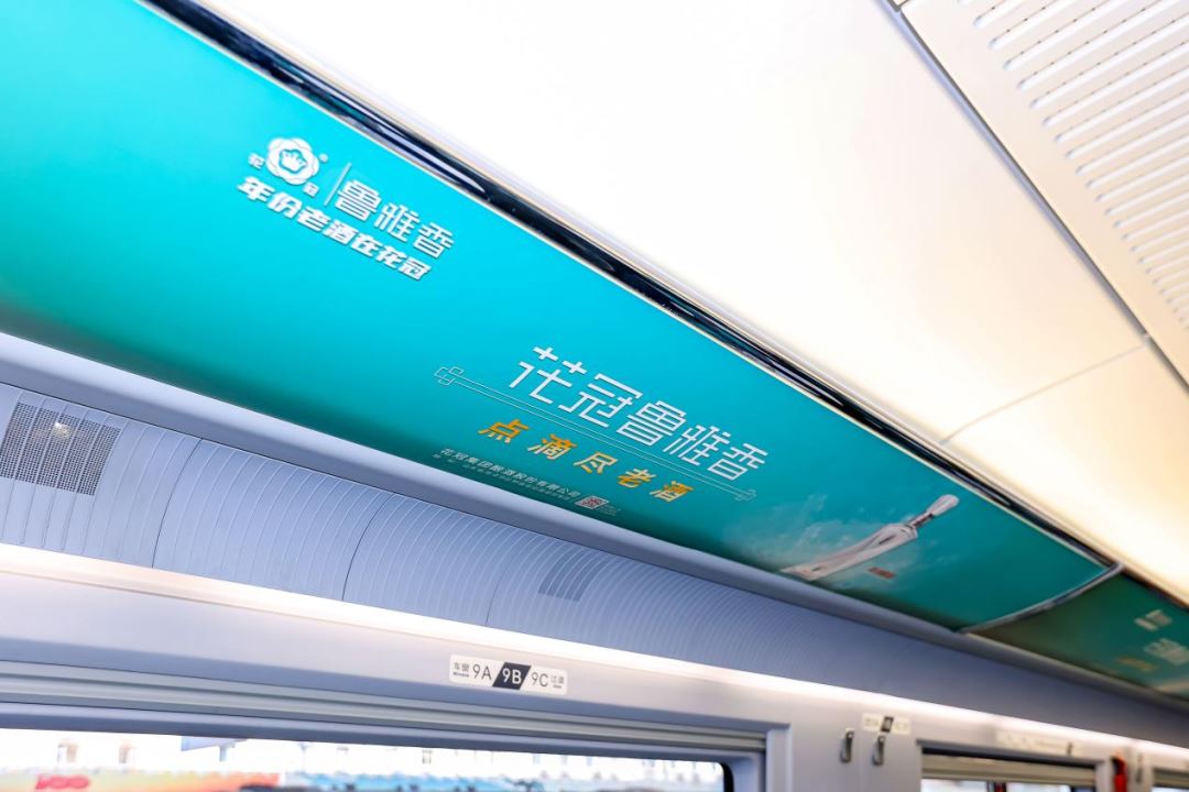 在“花冠鲁雅香,点滴尽老酒”高铁冠名列车内,随处可见花冠鲁雅香元素。头片、桌贴、海报、品牌天幕、车外门贴等媒体形式多维度展示着花冠鲁雅香的品牌形象。除了静态展示,还有语音播报、LED滚动屏、高铁视频等动态展示,整个列车内满满都是花冠鲁雅香甜柔绵长的酒香,也让旅客能深刻感受到花冠鲁雅香的酒文化底蕴与魅力。