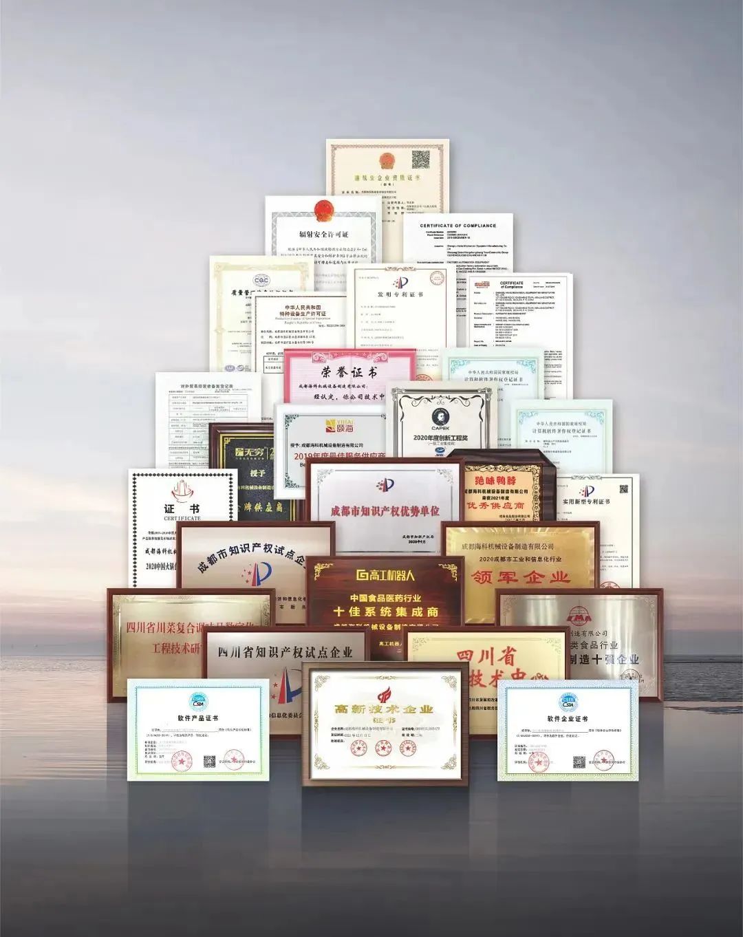 自海科成立以来,先后获得IS0:9001质量体系认证、国家级“高新技术企业”、“四川省企业技术中心”、“国家知识产权优势单位”、省级“国家知识产权试点”、“ 四川省川菜复合调味品数字化工程技术研究中心”、“四川省科学技术进步奖:二等奖”、“成都市技术中心”单位、“成都市知识产权优势单位”、“成都市工程和信息化行业领军企业”、“成都市小巨人培育企业”等荣誉。