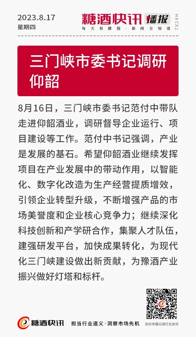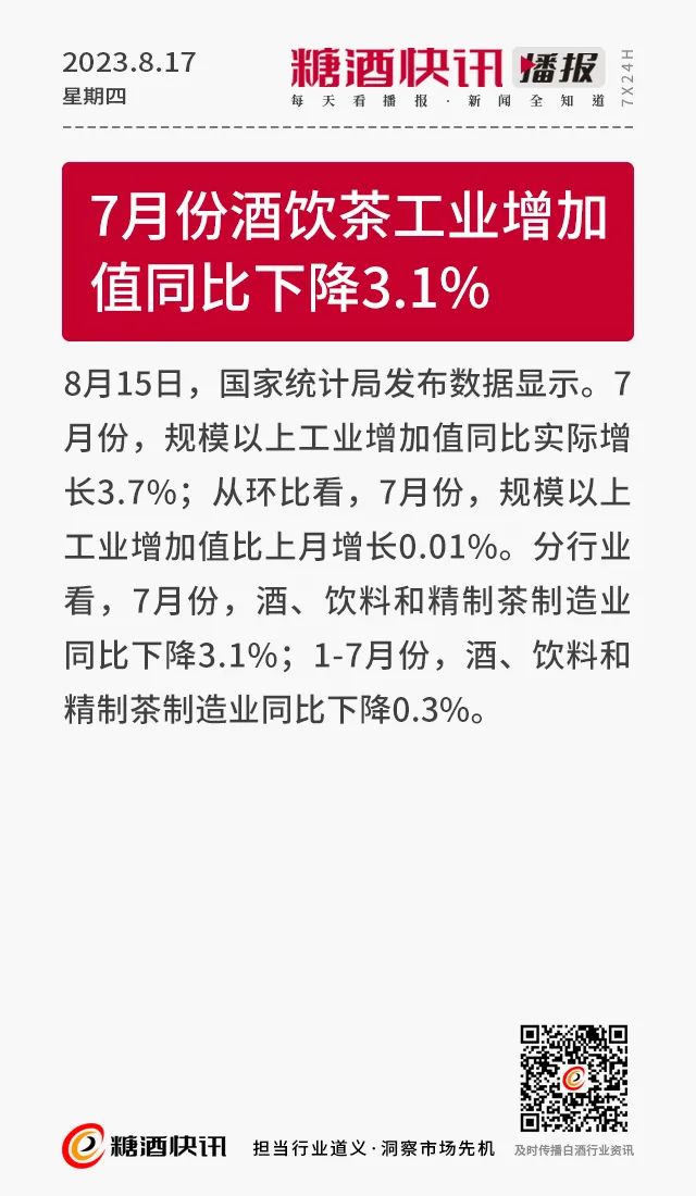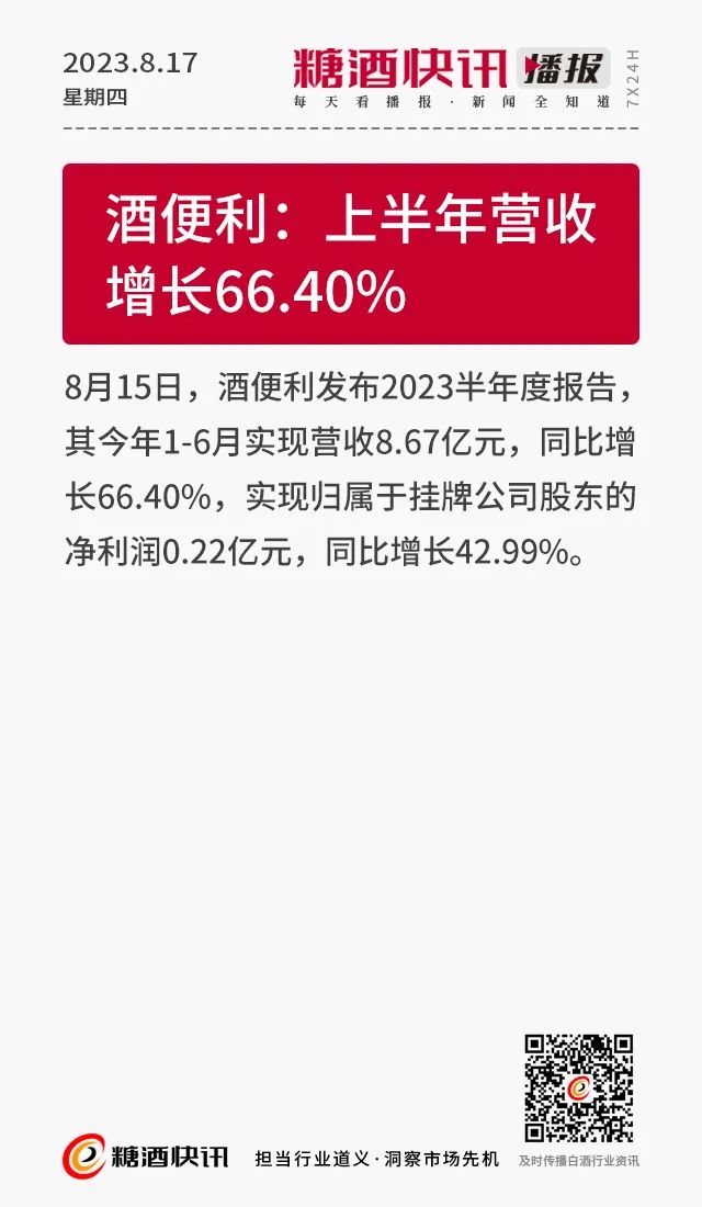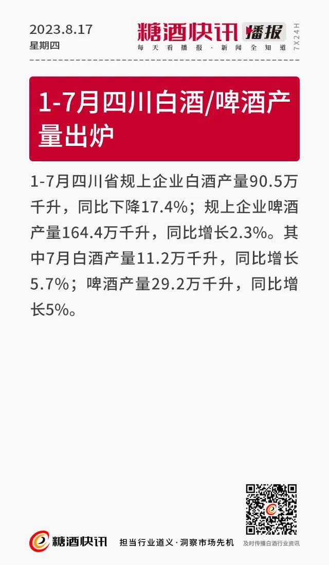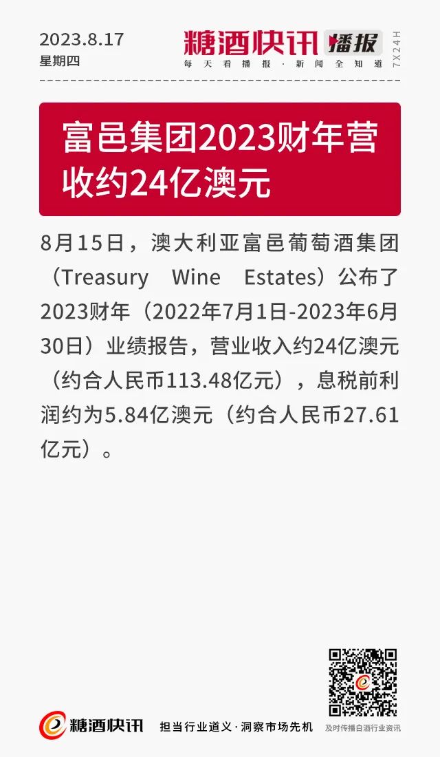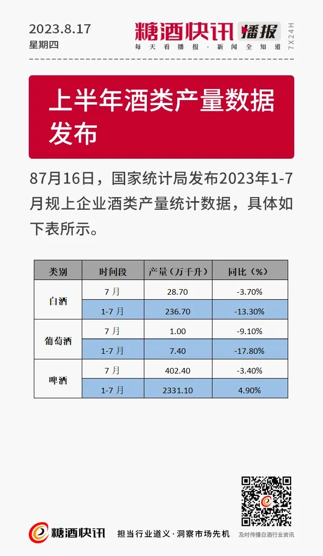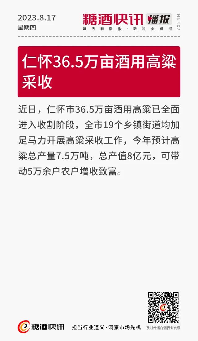 08.17 | 上半年酒类产量数据发布;仁怀36.5万亩酒用高粱采收;富邑集团发布2023财年业绩报告……