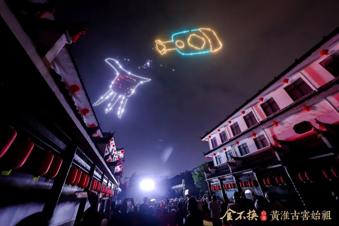 晚,金不换酒业还给嘉宾们献上了一场精彩绝伦的无人机表演,近千架无人机以夜空为幕,灯光为墨,在夜空中绘制出一幅幅绚烂的图案和文字,将古老匠心与现代科技的共鸣,在这场光影盛宴中具象化呈现。