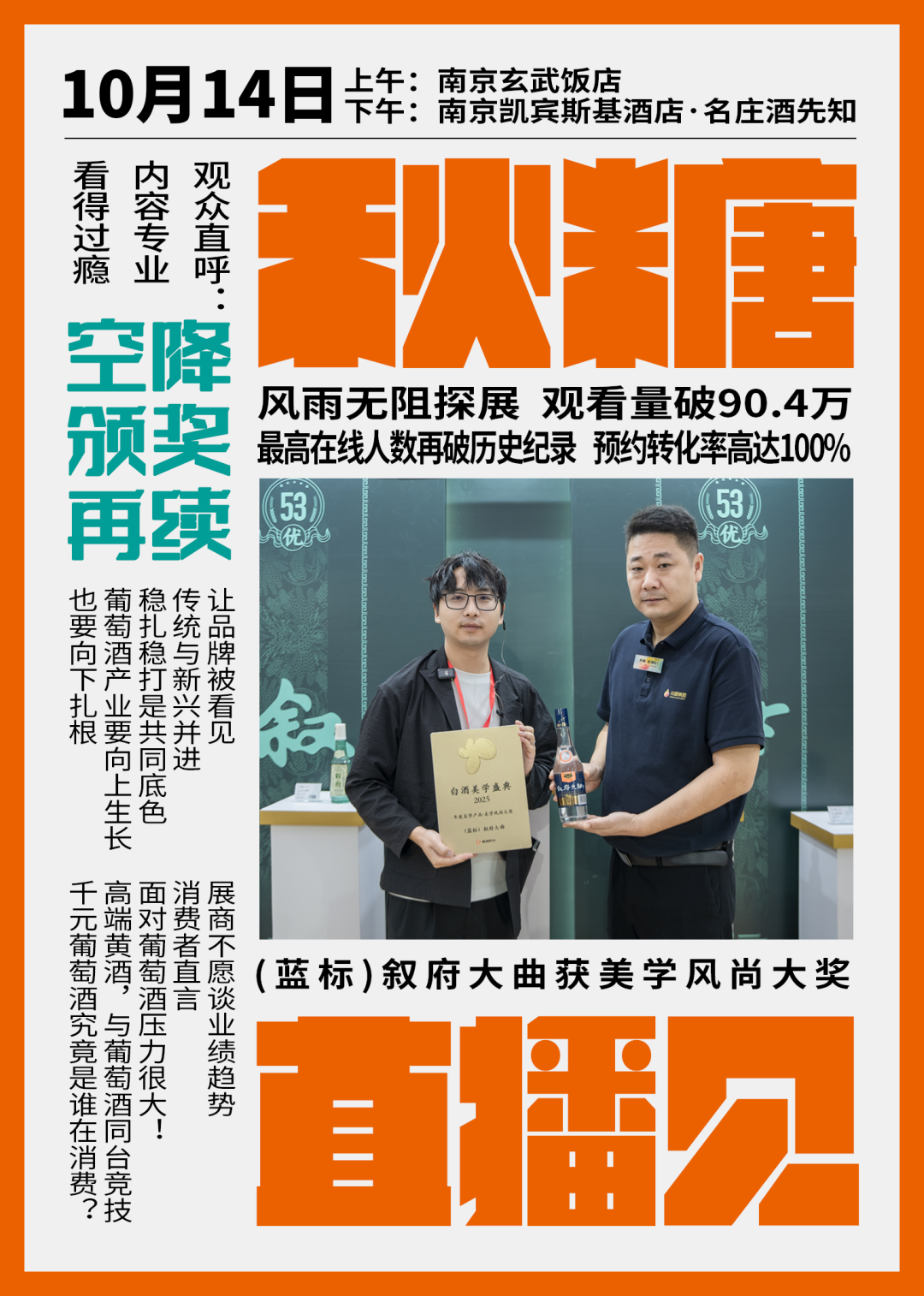 空降颁奖环节走进叙府酒业,(蓝标)叙府大曲荣膺「白酒美学盛典·2025年度美学产品·美学风尚大奖」。直播现场偶遇叙府酒业董事长熊吉,他分享了对行业调整期的思考:“越是在行业下行期,越不能躺平。要主动走出去,让品牌被看见,让经销商看到你的动作。不盲目扩张,以基地市场为基础,稳扎稳打。”