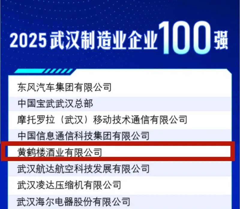 近日,武汉企业联合会、武汉企业家协会、武汉发展战略研究院联合发布《2025武汉企业100强、制造业企业100强、服务业企业100强分析报告》。黄鹤楼酒业再次登榜武汉制造业企业100强。