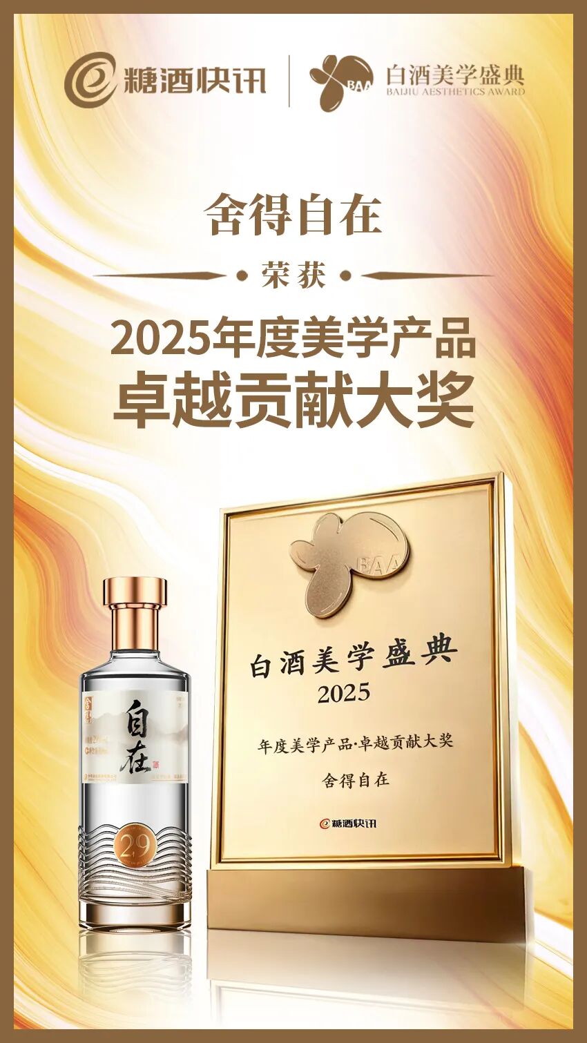 值得一提的是,近期在由糖酒快讯联合白酒美学盛典、酒视机构、《新食品》杂志共同发起的“2025年度美学产品网络评选”活动中,舍得自在再度脱颖而出,综合产品曝光度、营销话题热度和行业影响力等因素,在这场覆盖全行业的评选活动中,斩获“卓越贡献大奖”。