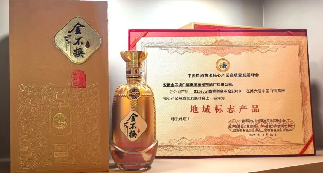 会上,根据专家组 20位国家级白酒评委对苏、鲁、豫、皖四省选送的产品专业感官鉴评,发布了《2025年第六届中国白酒黄淮核心产区地域标志和典型风格产品名录》,“52度亳香型金不换2000”(以下简称“金不换2000”)在苏鲁豫皖四省数家酒企提供的数百款精品白酒中脱颖而出,获评“地域标志产品”荣誉称号。