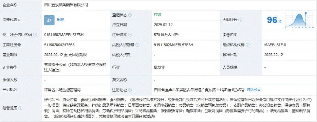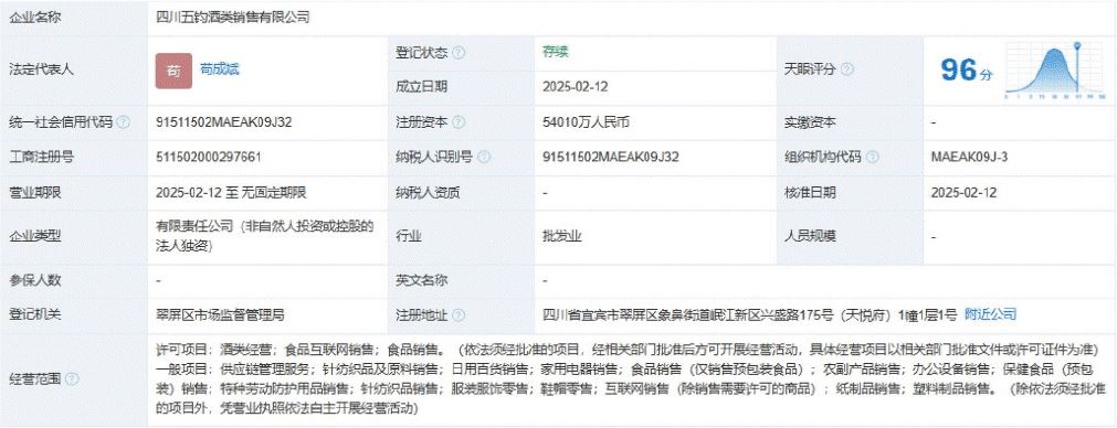 四川五钧酒类销售有限公与四川五浚酒类销售有限公司均于2025年2月12日注册成立,注册资本分别为5.4亿元和5.7亿元,注册地均为四川宜宾市翠屏区。