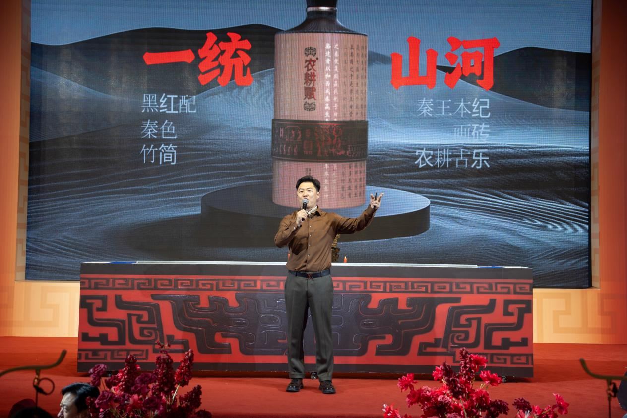 农耕酒业有限公司品牌创始人庄磊先生登台讲述《一统山河》的产品故事,伴随着升降台缓缓启动,全场灯光聚焦舞台中央,农耕赋《一统山河》佳酿尊崇亮相,大屏同步放大产品细节,其融合传统山河纹饰与现代艺术美学的瓶型设计,尽显 “一统山河” 的雄浑气象。
