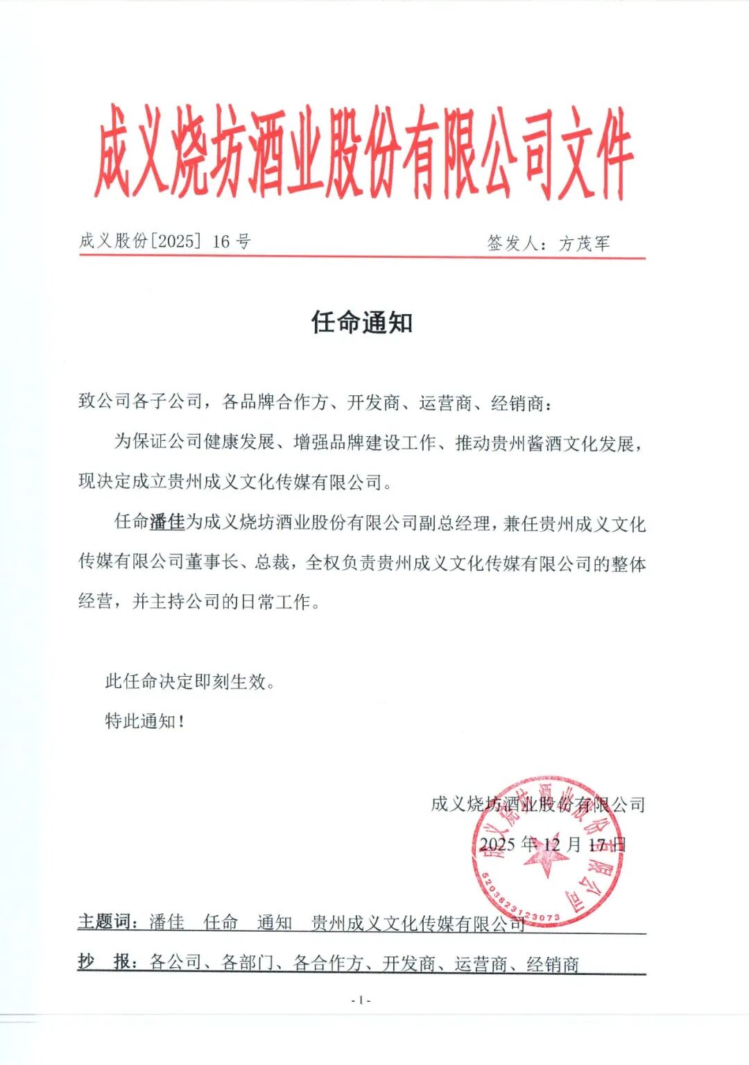 为保障贵州成义文化传媒有限公司的顺利运营,特任命潘佳为成义烧坊酒业股份有限公司副总经理,兼任贵州成义文化传媒有限公司董事长、总裁。