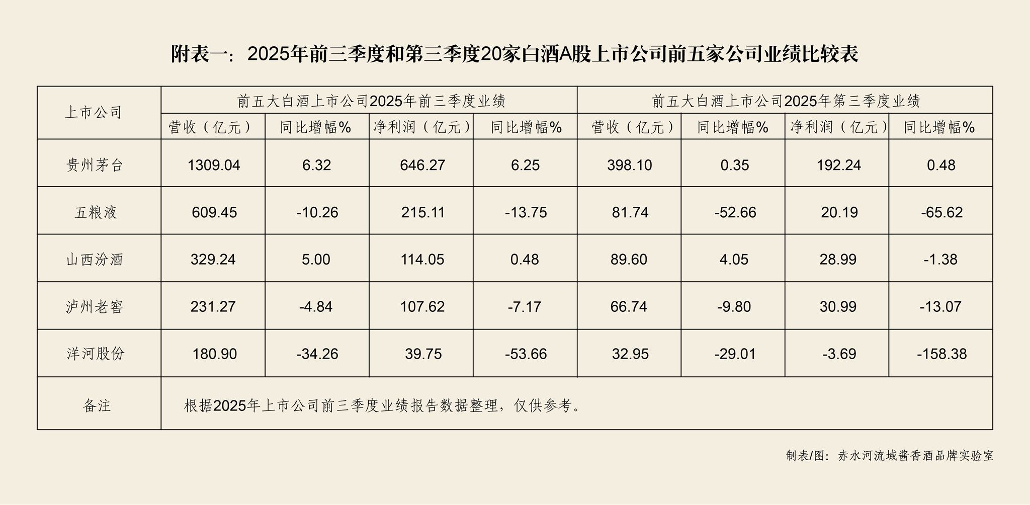 从20家A股上市公司中5家头部企业的数据看,贵州茅台、五粮液、山西汾酒、泸州老窖和洋河股份2025年前三季度营业总收入为2659.90亿元,占20家A股白酒类上市公司营业总收入的83.70%;净利润总额为1122.80亿元,占20家A股白酒类上市公司净利润总额的91.64%。