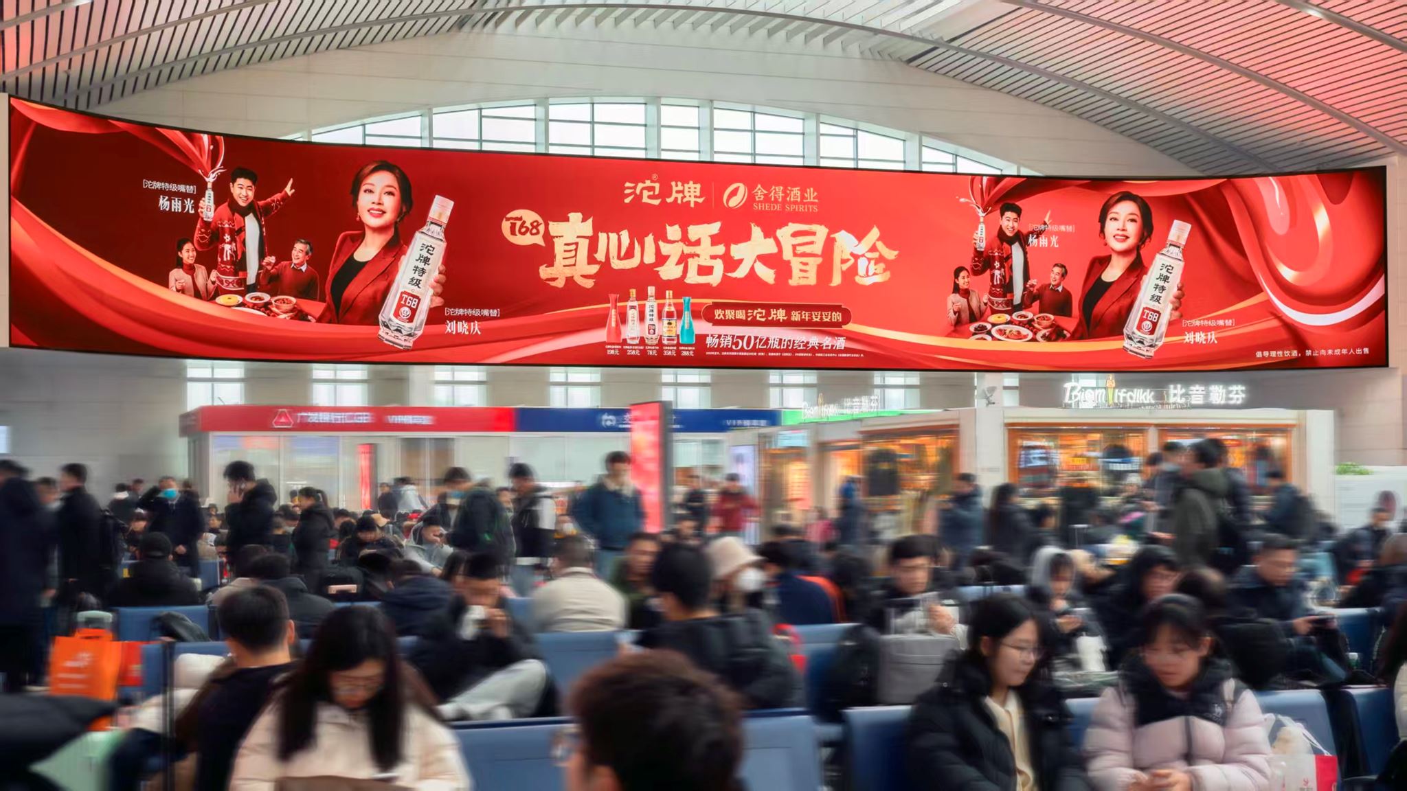 为实现传播效果的最大化转化,沱牌构建了“春运-聚会-购物”的全域媒介拦截网络。从核心省份高铁站、高速服务区加油站,到城市商圈互动大屏、全国数万家终端门店的氛围营造,品牌触点覆盖了消费者春节动线的每一个关键节点,形成了立体式的传播包围。
