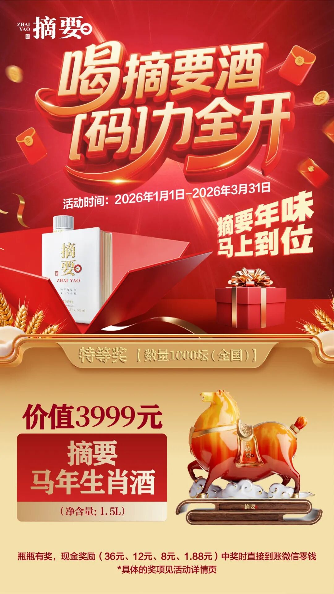 一方面,金沙酒业为新春添福,重磅开展了“喝摘要酒「码」力全开”送福活动,在“瓶瓶有奖”的力度下,为开瓶扫码的消费者送上现金红包以及价值3999元的摘要酒丙午马年生肖酒(1.5L收藏款)等实实在在的新春祝愿。其中,针对生肖酒大奖,金沙酒业秉承“双向激励”的政策,也极大地调动了经销商与终端伙伴的积极性,并主动加入到这场营销战役中,以自有的圈层影响力与传播工具助力产品动销与开瓶。
