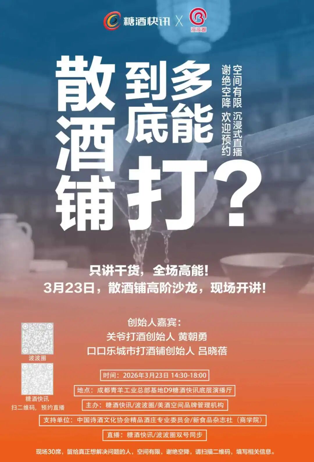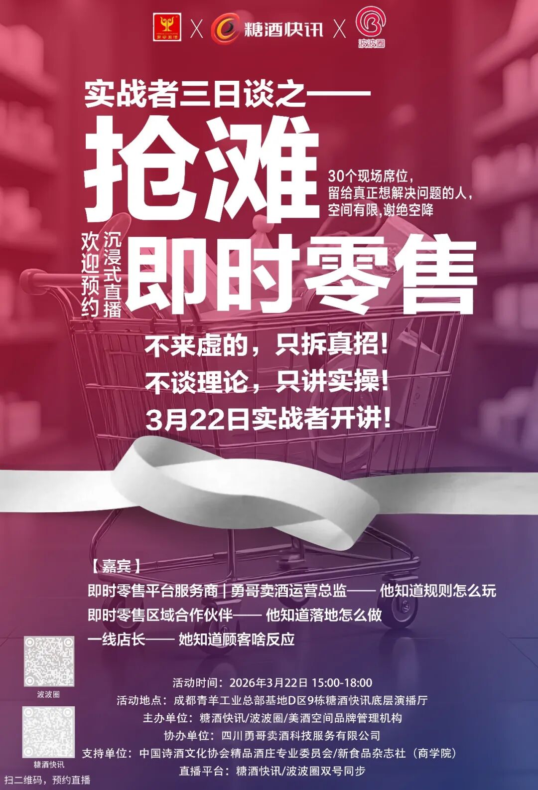 3月22日-24日,成都·青羊工业总部基地D9会客厅,三场干货沙龙,只讲真话,糖酒快讯/波波圈双平台直播,欢迎预约。