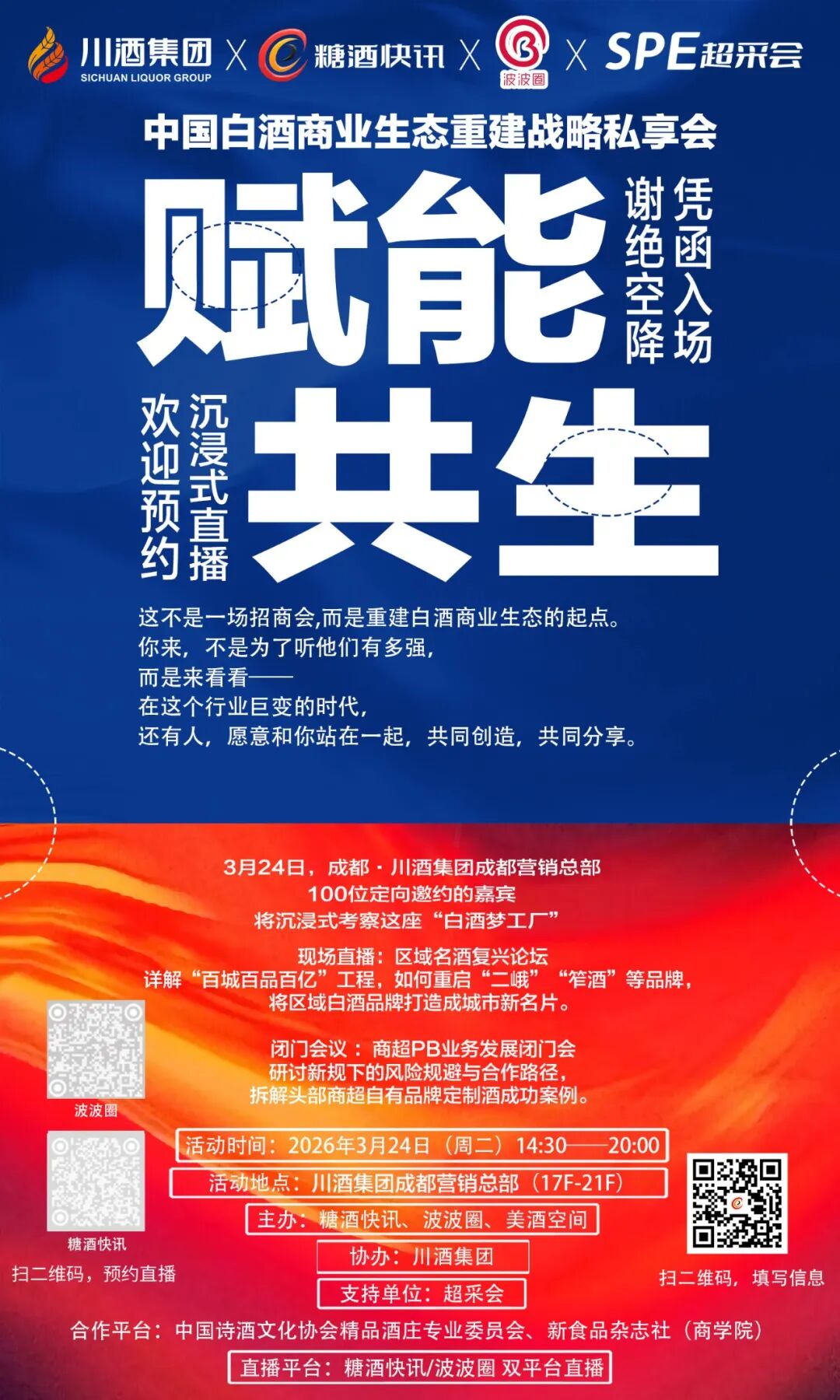 这是白酒行业第一家平台型企业——川酒集团的首次公开发声,分享他们的两类案例。“区域名酒复兴论坛”将详解“二峨”“重龙”“笮酒”等区域名酒复兴的政企合作模式与市场运营经验;“川酒集团供应链创新说明会”则将分享与多家知名商超自有品牌的开发定制案例。两场闭门会,不对外传播,只面向真正想解决问题的合作伙伴。