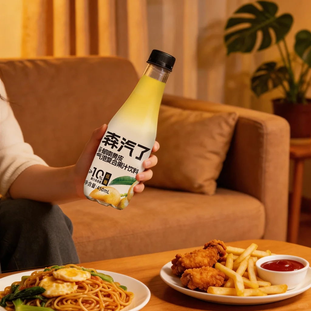黄皮气泡果汁真的很清爽,气泡绵密,冰冻后口感细腻,喝果汁一样,面对美食的油腻,那可黄皮味解腻程度拉满,下午茶,火锅,烧烤都十分适合,现在还出了PET瓶装,添加益生元味道更好。