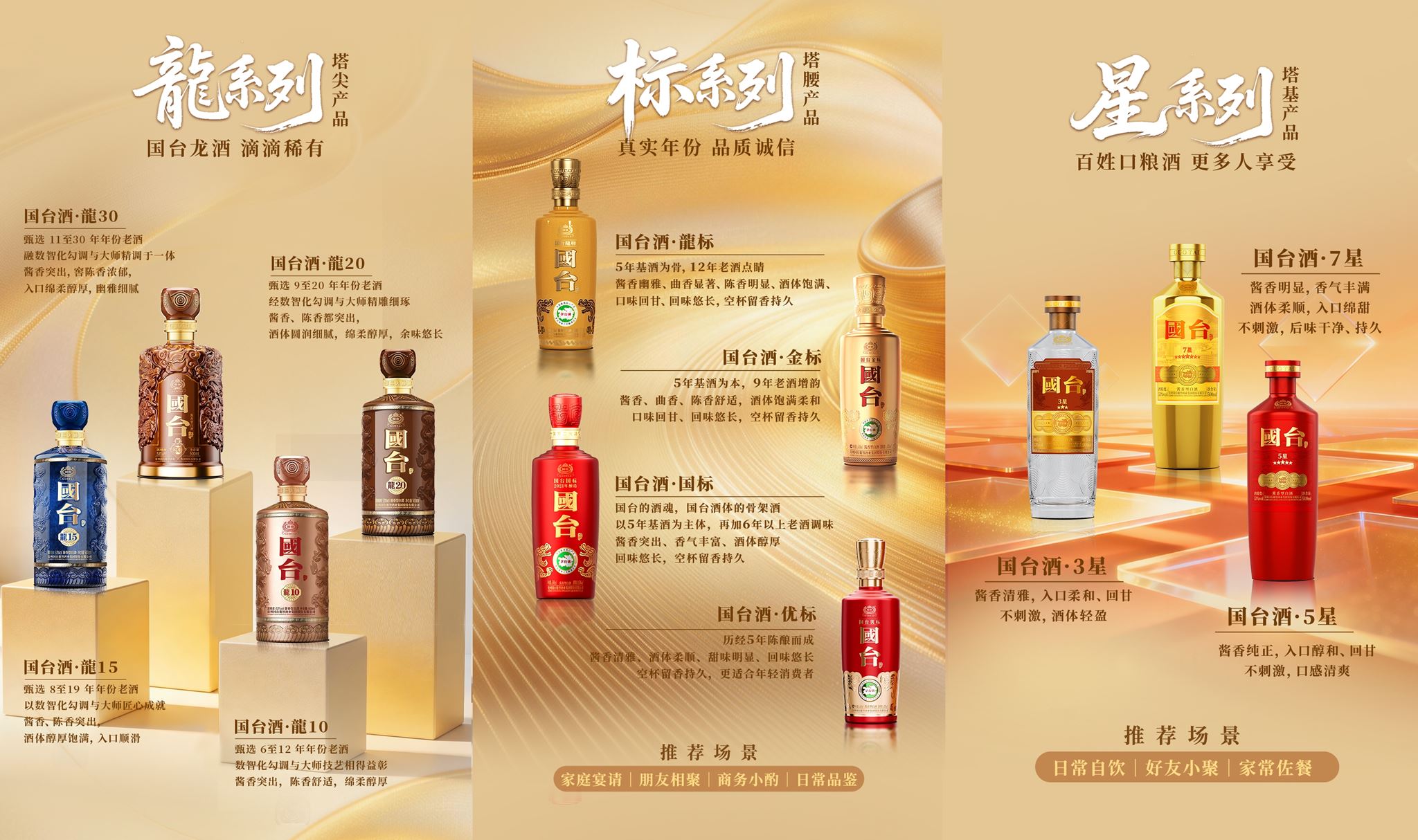 这套全新的产品体系以清晰的“金字塔”结构呈现:塔尖“龍系列”包括龍30、龍20、龍15,定位高端稀缺,占据500元至1000元以上价格带,承担品牌高度与价值标杆作用;塔腰“标系列”涵盖龙标、金标、国标、优标,主打真实年份酒,覆盖260元至500元核心价格带,是国台的基本盘;塔基“星系列”则包括三星、五星、七星,以及怀酒系列、定制开发酒系列,则定位大众酱香,覆盖100元至260元价格带,用于市场渗透和消费普及。