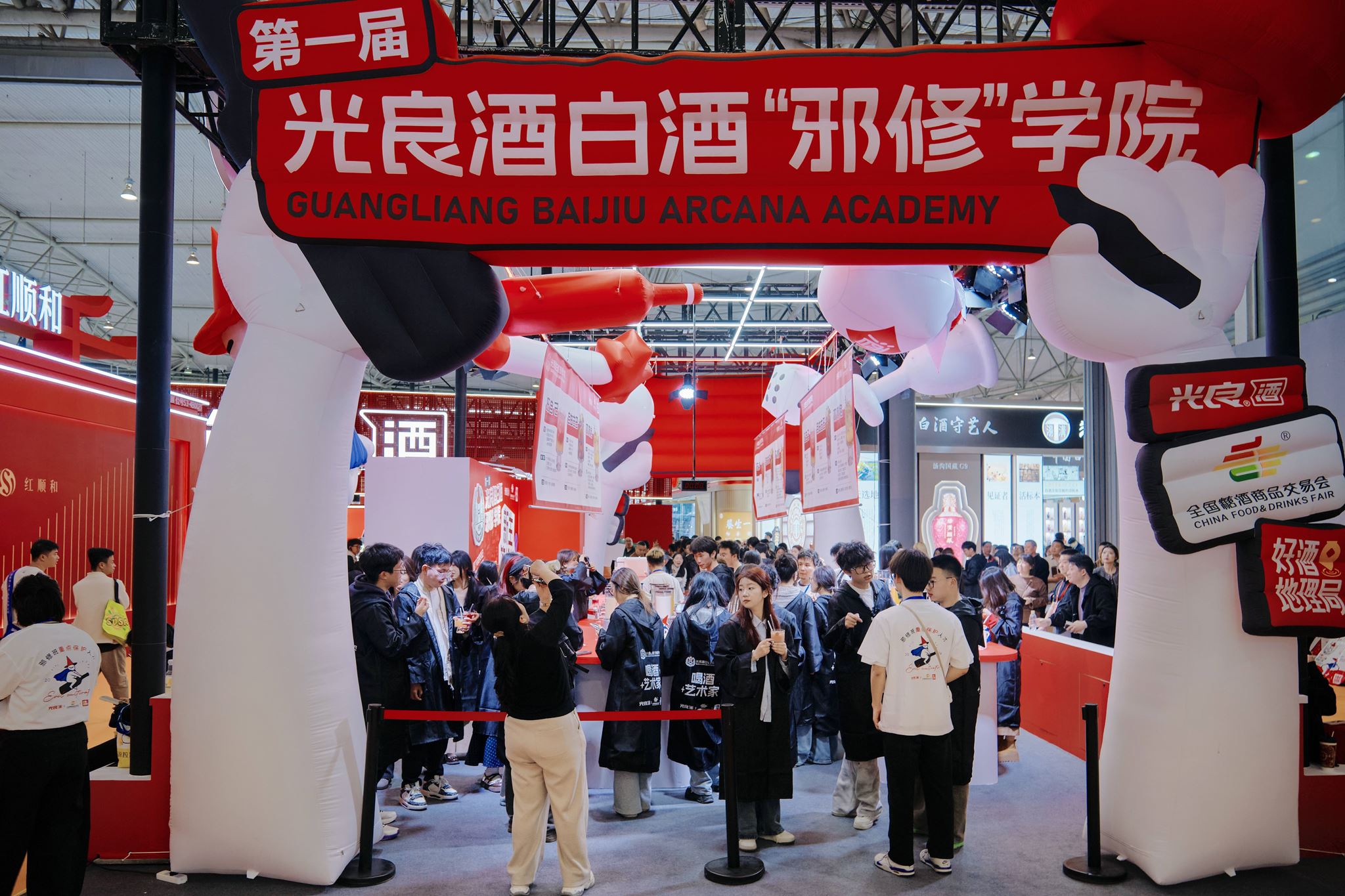 巨大的充气拱门占据了入口核心,红白撞色的主视觉极具冲击力;两只卡通化的白色大手托举着醒目的“光良酒白酒‘邪修’学院”红色招牌;拱门右侧还戴着一顶俏皮的红色巫师帽,瞬间拉满“魔法学院”的氛围感。