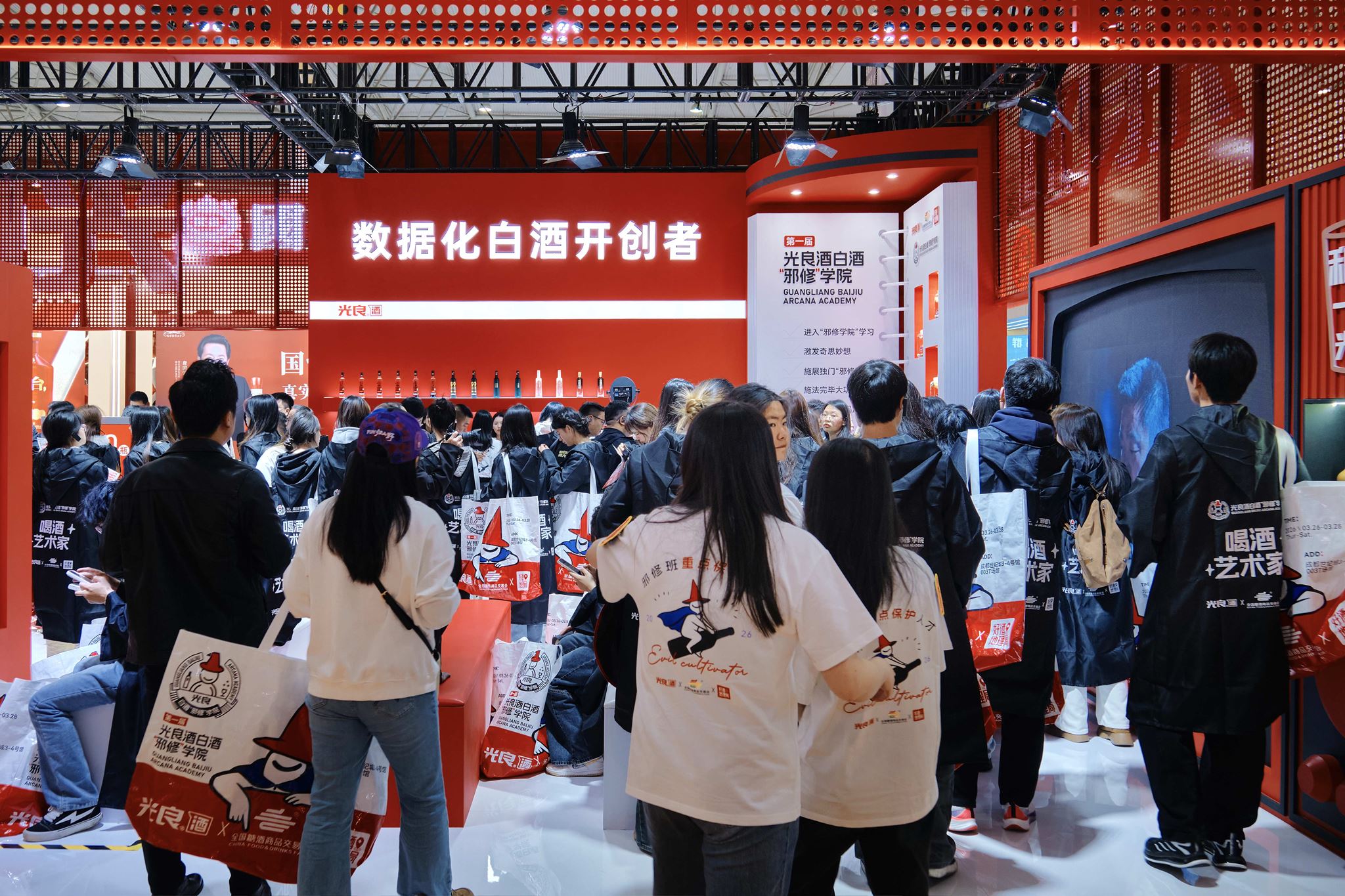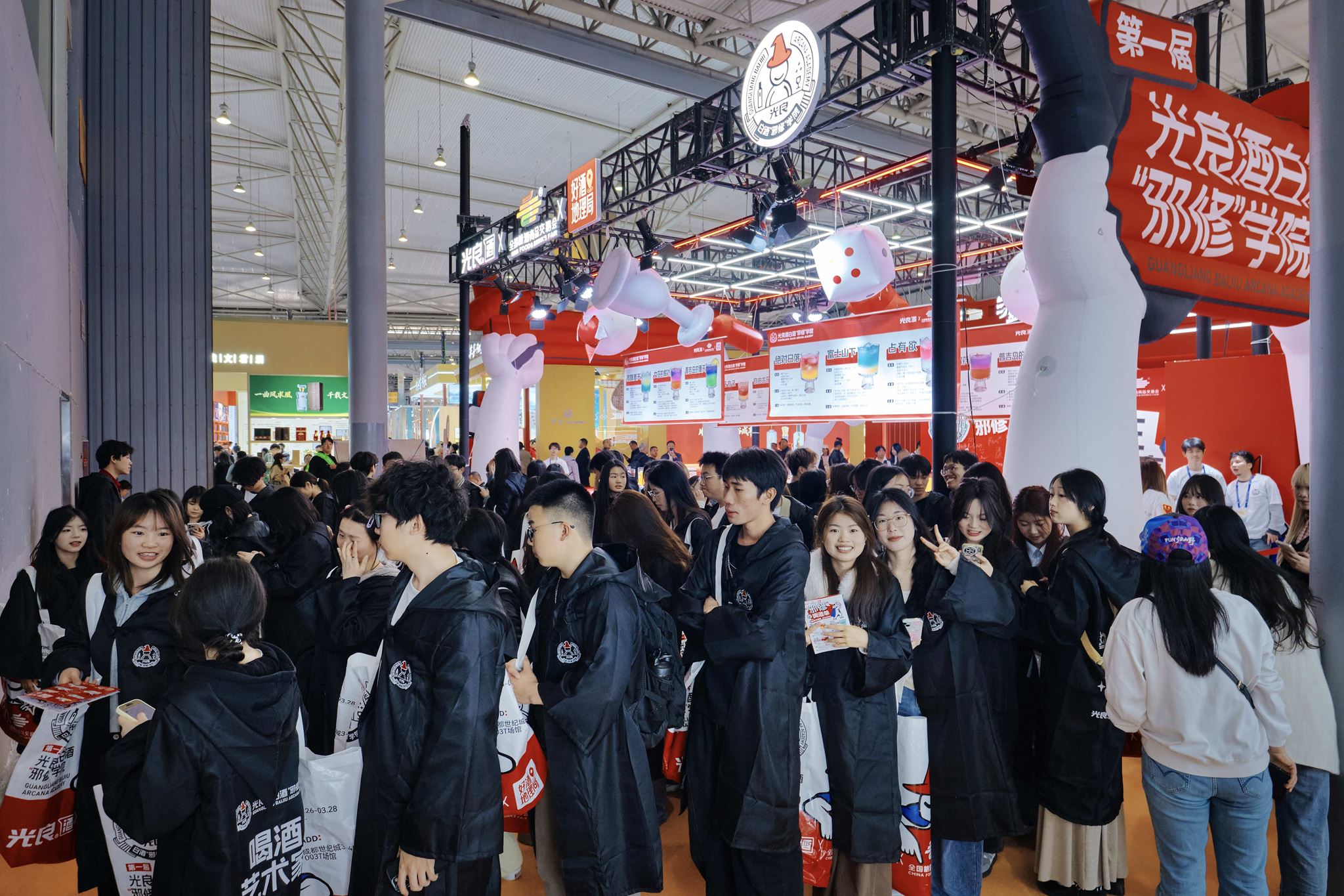 在光良酒白酒“邪修”学院现场,超1000名身着“魔法袍”的大学生涌入展位,沉迷“邪修”调酒,不停地拍照、打卡,洋溢的青春气息构成了一道独特的风景线。