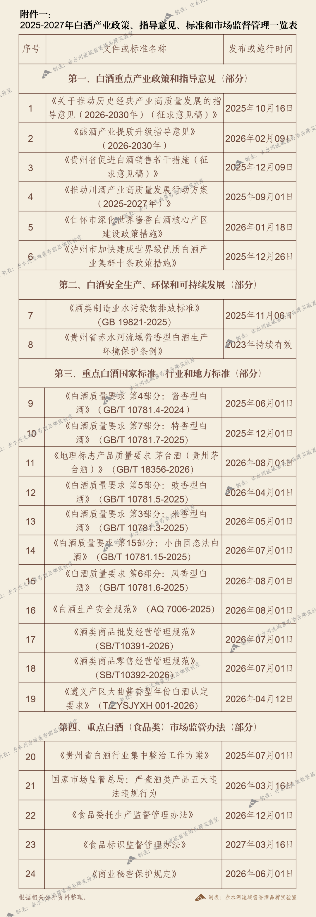 再次,从强化标准和标准化的层面,除已于2025年正式施行的《白酒质量要求第4部分:酱香型白酒》(GB/T 10781.4-2024)、《白酒质量要求第7部分:特香型白酒》(GB/T 10781.7-2025)和《酒类制造业水污染物排放标准》(GB 19821-2025)等外,2026年将逐步施行《地理标志产品质量要求:茅台酒(贵州茅台酒)》(GB/T 18356-2026)、《白酒质量要求第3部分:米香型白酒》(GB/T 10781.3-2025)、《白酒质量要求第5部分:豉香型白酒》(GB/T 10781.5-2025)、《白酒质量要求第6部分:凤香型白酒》(GB/T 10781.6-2025)、《白酒质量要求第15部分:小曲固态法白酒》(GB/T 10781.15-2025)等国家标准和《遵义产区大曲酱香型年份白酒认定要求》(T/ZYSJYXH 001-2026)等行业和地方标准。