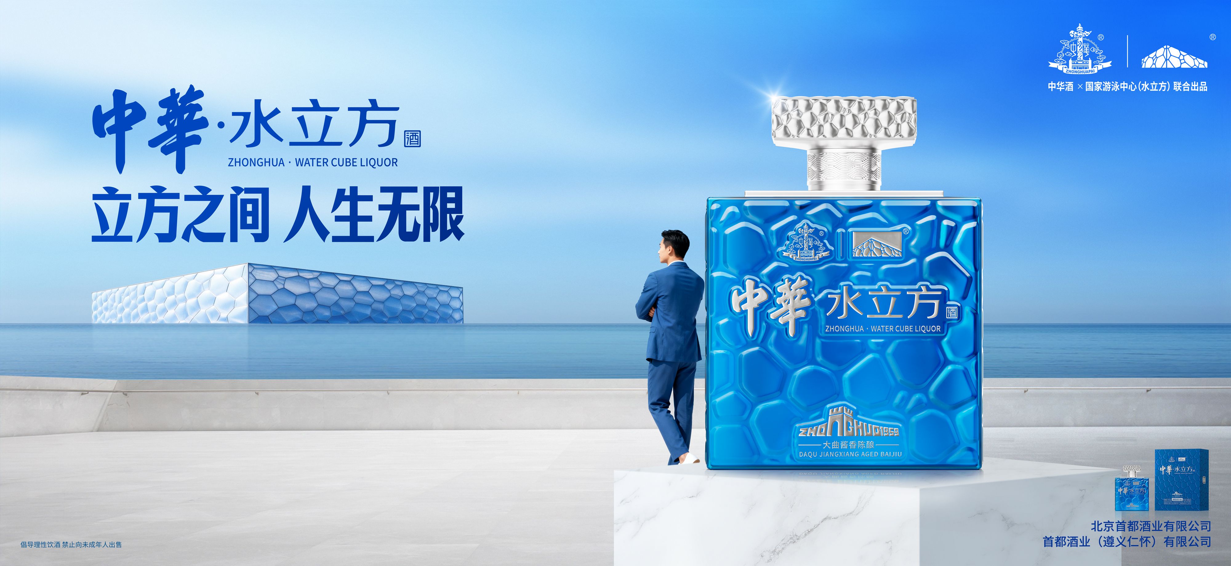 此外,首酒公司重点展示了另一款重磅IP产品“中华·水立方酒”,备受瞩目。这款由中华酒品牌与国家游泳中心·水立方联袂推出的次高端战略新品,成为消博会上极具辨识度的一抹靓丽蓝色。