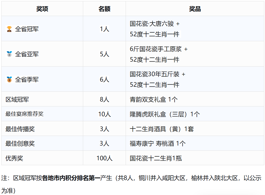 4月15日,国花瓷西凤酒第二届「醉美推荐官」评选活动正式启幕。活动针对陕西省内烟酒店老板、实际经营者,即日起至5月31日,拍摄符合要求的国花瓷相关短视频,发布到抖音/视频号任意平台,文案添加话题#第二届国花瓷醉美推荐官,或者成功推荐宴席用国花瓷,即可获得相应积分,根据积分排名评选出对应奖项并获得奖品。(国花瓷西凤酒)