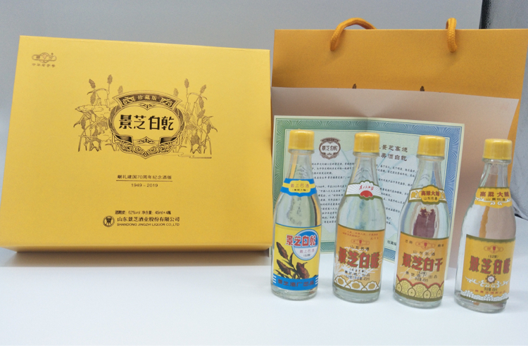 2019年6月,为献礼建国70周年景芝酒业特推出复刻版景芝白干纪念酒版套装,经典62度,45毫升,以60年代,70年代,80年代,90年代四款复古原始经典风格的景芝白乾为主题,以老黄皮的经典“黄”风格为主线,再现老黄皮的历史味道和时代记忆,浓缩景芝白乾千年历史,献礼建国70年辉煌岁月,景芝白乾,传奇老字号,限量发行2000多套,独立编号,此款精品必将成为2019收藏界典藏级收藏佳品。
