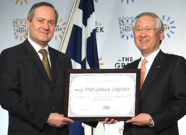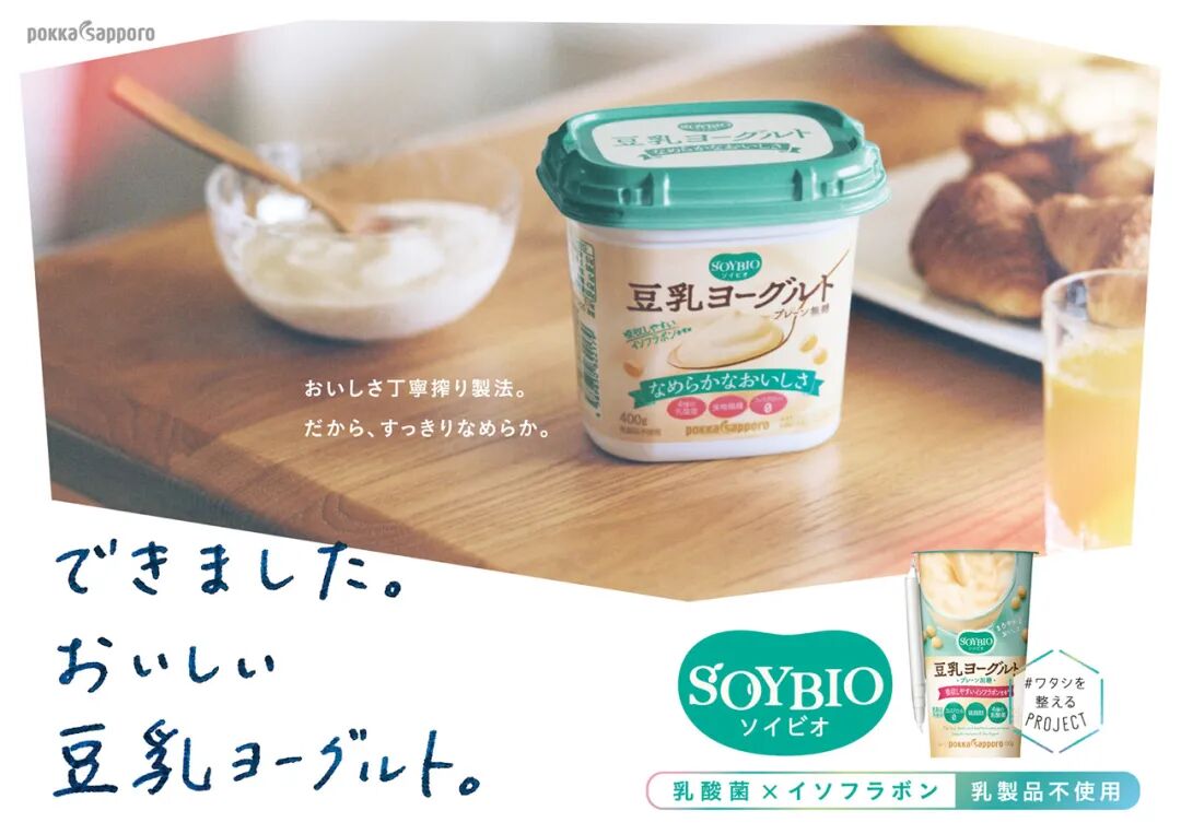 希腊酸奶在这个时期也有突飞猛进的发展。森永在2011年9月推出日本第一款希腊酸奶「濃密ギリシャヨーグルト パルテノ」。产品完全继承了希腊酸奶的浓稠特点,据说将汤匙插入其中,杯体倒置,勺子也不会掉下。光滑的奶油质感,超高蛋白含量,搭配蜂蜜的贴心设计,产品名称和杯身设计上典型的希腊元素,都让这款产品在当时十分抢眼。此后,达能日本推出oikos,永旺推出自有品牌PB希腊酸奶,在日本掀起高蛋白型酸奶的热潮。2018年9月,明治终于进军希腊酸奶,发布「ザ グリーク ヨーグルト」,包含原味、混合水果及蓝莓果酱三种口味。尽管比同行们晚来数年,但明治耕耘希腊酸奶市场的信心满满。在发布会现场,一如30多年前与保加利亚政府开展无间合作相仿,此次邀请希腊驻日大使亲临现场,向外界表明明治希腊酸奶的官方背景与正统地位。在此之前,明治已在8月初日本全国营养周期间对国民进行一轮普及宣传,积极树立希腊酸奶领军者的形象。2018年,明治推出的首款希腊酸奶。图片来源:日本雅虎2018年9月9日,希腊驻日本大使卡斯·卡拉索利斯与明治社长川村一夫共同出席“明治希腊酸奶”新品发布会。图片来源:ssnp.co.jp最后提一下火遍全球的植物基酸奶。日本的植物基酸奶主要以米、酒粕、大豆等食材为基底,配合来源于传统渍物、味增、纳豆等食品的植物性乳酸菌发酵。其中,以大豆为基底发酵的产品由于富含大豆异黄酮和膳食纤维,不含胆固醇而备受瞩目。近年来,植物基蛋白来源扩大到坚果,扁桃仁发酵酸奶也现身市场。据富士经济今年2月所做的市场调查,2019年日本植物基酸奶市场份额与2018年相比增长3.8%,为27亿日元;2024年将增至33亿日元。Pokka Sapporo(百佳)是日本大豆基植物酸奶中的代表。2018年,百佳推出SOYBIO品牌,主打健康美容,产品一经上市就在30-40年龄段女性中引起了强烈反响。它最大的卖点在于富含异黄酮和膳食纤维,低脂零胆固醇。有助于预防癌症、骨质疏松、代谢综合症、更年期综合症等。整个百佳公司的大豆酸奶销售额2019年达到20亿日元,占全日本豆酸奶市场份额50%以上。日本酸奶历经百年坎坷,仍然取得今天的成就,令人深思不已。在日本这里,我们没有看到如美国酸奶市场那样新锐辈出,新老迭代的局面,看到的是几家巨头企业各自耕耘,在暗自较量中推动酸奶产业的整体水平。我们也没有看到大众饮食潮流对于产业走向的根本性影响,看到的是企业对于消费诉求的深刻洞察,对基础研究的坚持不懈,对匠心精神的反复诠释。日本酸奶的发展中,始终贯穿2个关键词:本土化与个性化。日本独特的地形、资源,以及近现代历史轨迹铸成的民族危机意识,都使得本土上的东西被格外看重,包括农副产品,饮食文化以及屡屡被世人称道的工匠精神。酸奶也不例外,从传统食材,风味口感,到功能诉求,包装风格。欧美传入的只是概念,日本食企将它们彻底改造成日本造、日本货。