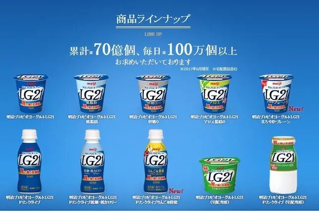 1985年与美国签订“广场协议”,一般被视为日本经济萧条的肇始。1989年年中,日本央行开始加息。1990年,政府推出打击地价泡沫的调控政策。1997年,亚洲金融危机袭来,日本经济雪上加霜,最终停下飞奔了30余年的脚步。这一时期,居民收入增长迟缓,国民消费逐渐回归理性,地方传统文化崛起,主流文化开始倡导日式的简约和审美。此时,酸奶的健康与美味形象已经深入人心,人们在压缩非理性、非必要开销的同时,对于能够带来健康与满足感的酸奶却依然痴心不改。经过60-80年代的积累,各大乳企逐步完善了产品线,技术工艺趋于成熟,消费市场趋向理性。这一时期,是日本酸奶百花齐放,突飞猛进的20年。从创新方向上,我们可以大致梳理出2条主线:1993年,明治将沿用已久的保加利亚酸奶菌株更换为LB81,该菌株具有更优秀的整肠效果。1996年,保加利亚酸奶获得酸奶领域第一款特定保健用食品认证。经过数代更迭,明治保加利亚酸奶作为无添加酸奶的代表,始终在日本酸奶市场中占有重要地位。产品包装从纸盒到塑料盒,发酵方法发展到低温低氧工艺,保证菌株活力与发酵充分。1998年,明治研究人员从公司保存的2500多种菌株中挑选出具有最佳整肠效果的菌株——LG21。2000年,采用LG21菌株发酵的酸奶「明治プロビオヨーグルトLG21」正式发售。在当时,这是首款作为日常食品支持人体健康的产品,发售之后引起巨大轰动,也开创了一个全新市场。继LG21之后,R-1、LB81、PA-3等具有不同保健功能的菌株相继面世。多种附加健康价值的酸奶为市场注入了新的活力,也引领了健康食品的风潮。明治旗下以LG21为核心菌株的酸奶产品已经形成庞大的家族。自2000年3月首款酸奶问世,到2017年6月,累计销量超过70亿盒。平均每个日本人每年食用近4盒。图片来源:明治公司官网1996年,明治率先响应政府颁布的Food for Specified Health Use(FOSHU,特定健康食品法案),在包装标签上进行功能标示,将包装酸奶带入功能时代。这也是明治酸奶得以继续保持领先地位的重要原因。七八十年代BB536的辉煌没有让森永居功自傲,他们对菌株的功效研究持续开展,终于在1996年,双歧杆菌普通酸奶「森永ビヒダスヨーグルト」获得“特定保健用食品”许可。2001年,圆杯装酸奶获得特保食品认证。1996年,森永双歧杆菌普通酸奶获得“特定保健用食品”许可。图片来源:oshihaku.jp2007年,BB536菌株获得了美国GRAS(一般公认安全)认证。2019年7月,值BB536开发50周年之际,该菌株被美国FDA允许用于安全等级最高的婴儿配方食品中,这是对森永益生菌研究实力和历史地位的最好肯定。以BB536为发端,森永日后相继研发出短双歧杆菌A1,婴儿双歧杆菌M-63,在日本益生菌研究领域树立起自己的旗帜。