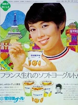明治在2012年底,为纪念首款保加利亚纯酸奶问世四十年,推出的纪念款酸奶。图片来源:amazon.jp不只是明治,雪印在此期间也紧跟流行趋势。他们在1969年推出第一款带有果肉的酸奶,风靡一时。产品口感与一般的果味酸奶截然不同,真实的果肉嚼在口中,带来十足的满足感。雪印还请到当时玉女偶像岡崎友紀作为代言人,是日本昭和时代向往洋风的一个缩影,直到现在还被老一辈人所怀念。1972年,雪印率先推出采用屋顶包装的纯原味酸奶。与传统的圆杯相比,屋顶包具有更挺拔的身姿,视觉效果更佳;而与瓶子包装相比,它又更便于饮用,撕开顶角,稍稍倾斜即可入口,而不必像瓶装酸奶需要仰起脖子才能喝到。此外,这款产品中的菌株均来源于北海道当地,是雪印作为北海道企业因地制宜,就地取材的一次尝试。这也成为日后雪印酸奶的一大特色。