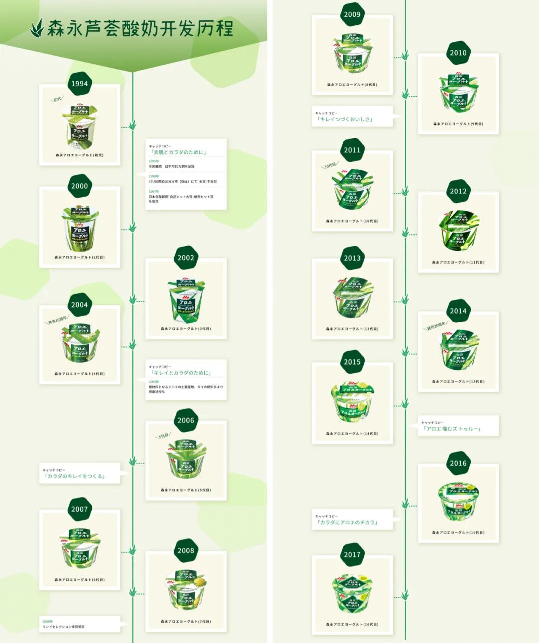 2、在食材与风味上和洋相融,创造独具特色的日式酸奶对酸奶这个舶来品进行本土化改造,并不是日本乳企的专利,但他们无疑做得更加出色,游刃有余。森永旗下著名的芦荟酸奶可以作为日式酸奶的一个典范。在乳源、菌株基本固化,工艺相近的基础上,如何让产品更有特色,引入特征食材就成为差异化的关键。1990年代,森永着力寻找“口感具有特点,且对健康有益的素材”。除去椰果之外,研发团队先后尝试了魔芋、木薯、生姜等各种食材,最终将目标锁定在了芦荟。芦荟自古就被人们用作烫伤药和胃肠药;芦荟提取物则被用在化妆品中。但芦荟叶口感苦涩,不适合作为食材。开发人员提出将芦荟叶肉添加在酸奶中。芦荟叶肉质地水润、口感弹性,无色无味,外观晶莹透明,与酸奶的健康形象十分契合。1994年,「森永アロエヨーグルト」正式发售。一开始,芦荟苦涩的印象让消费者望而却步,但品尝之后,苦味很好地融入到酸奶中,清香的感觉让产品与众不同,一时间好评如潮,口口相传。之后,芦荟酸奶开启了它的逆袭之旅:1995年日平均销量达到10万盒,1996年获得巴黎国际食品博览会金奖,1997年获得日本食粮新闻社优秀产品奖。2008年,已改良至第7代的芦荟酸奶获得MONDE SELECTION(世界品质评鉴大会)金奖。2017年,在美国西部天然产品博览会上亮相,打入北美市场。2019年,芦荟酸奶问世25周年,经过16代更迭后,产品宣称语从最初的“保护肌肤与身体”变为“给身体以芦荟之力”,包装仍是满眼绿色,向世人宣告产品历久弥新,永葆活力。森永芦荟酸奶发展史。图片来源:aloe.ne.jp抹茶、板栗、红豆、红薯、年糕……日式饮食中的每一款传统食材都可以让酸奶充满和风。秋天的味道尤其令日本人青睐。明治的栗子酸奶「明治和匠ヨーグルト 和栗あずき」,以及达能日本的柿子酸奶「ダノン 和Selection ほうじ茶風味 柿果肉入り」堪称和风佳品。前者以甜红豆粒打底,上面浇铸栗子味酸奶,制成双层混合风味的和风甜点。后者突出柿子果肉味道,黑色背景映衬出橙红色柿子果的香甜,一种尽显奢华的秋韵呼之欲出。注重产品细节,体现人性化设计,这也是日式酸奶的重要特征。2011年,森永与东洋铝业合作开发了不沾酸奶的杯盖。众所周知,荷叶能防水并保持干燥和清洁,杯盖材质采用了一种被称为TOYAL LOTUS?的仿生技术,模仿“荷叶表面不沾水”的原理,通过无数个肉眼无法观察的凸凹构造,使水、酸奶、甚至油脂都无法附着。最初,这种神奇杯盖先在森永芦荟酸奶的季节限定款中试用。看到效果被消费者认可,遂扩展到其他几类产品中。除了菌株研究和突出日式特点,日本乳企也在此期间尝试开拓新的酸奶销售渠道。森永在90年代初推出到家配送业务后,不断开发与之配套的产品,让直送成为提高市场占有率的有力手段。1991年,森永推出专用于配送到家业务的乳酸菌饮料「森永カルダス」。2006年发售强化铁质的「ラクトフェリンFe」,2013年推出「カラダ強くするヨーグルト」,添加5%双歧杆菌与乳铁蛋白。森永于1991年推出配送到家业务专用的乳酸菌饮料「森永カルダス」,在2001年获得特保食品许可。图片来源:doshin-apple-news.jp06、2010-2020:老龄化与低欲望社会,酸奶市场格局趋稳,功能产品大放异彩2010年,中国GDP超越日本,成为世界第二大经济体。除了经济乏力,日本的老龄化问题也相当严峻, 65岁以上老人占总人口的23%。日本人类发展指数(人均GDP+教育+医疗)从泡沫经济前的世界第一掉落至2007年的世界第十七。老龄化加速,消费信心大减,日本进入了低欲望社会。10年间,日本酸奶产业实现了平稳增长。占比最大的两个细分品类——勺吃型酸奶和饮用型酸奶,在2016年的销售额达到顶峰,合计接近4800亿日元。低温乳酸菌饮料和常温型乳酸饮料则在400-600亿日元区间浮动。就整个发酵乳市场而言,贡献最大的无疑是饮用型酸奶。2011-2019年,日本发酵乳市场中主要细分品类的销售额增长图。图片来源:prtimes.jp在经过90年代与新世纪第一个十年的厚积薄发之后,酸奶市场日渐饱和,各大乳企的竞争进入平稳期,市场份额起伏不大。尽管仍然有令人惊叹的爆品不时涌现,但难以改变整体市场格局。仅看2013-2018年这6年的数据,明治、养乐多和雪印都有小幅上升,而森永、达能份额微降。TOP5的市场集中度进一步提高。日本酸奶企业市场份额变化图,数据来源:kknews.cc/finance/bmb6ge6.html