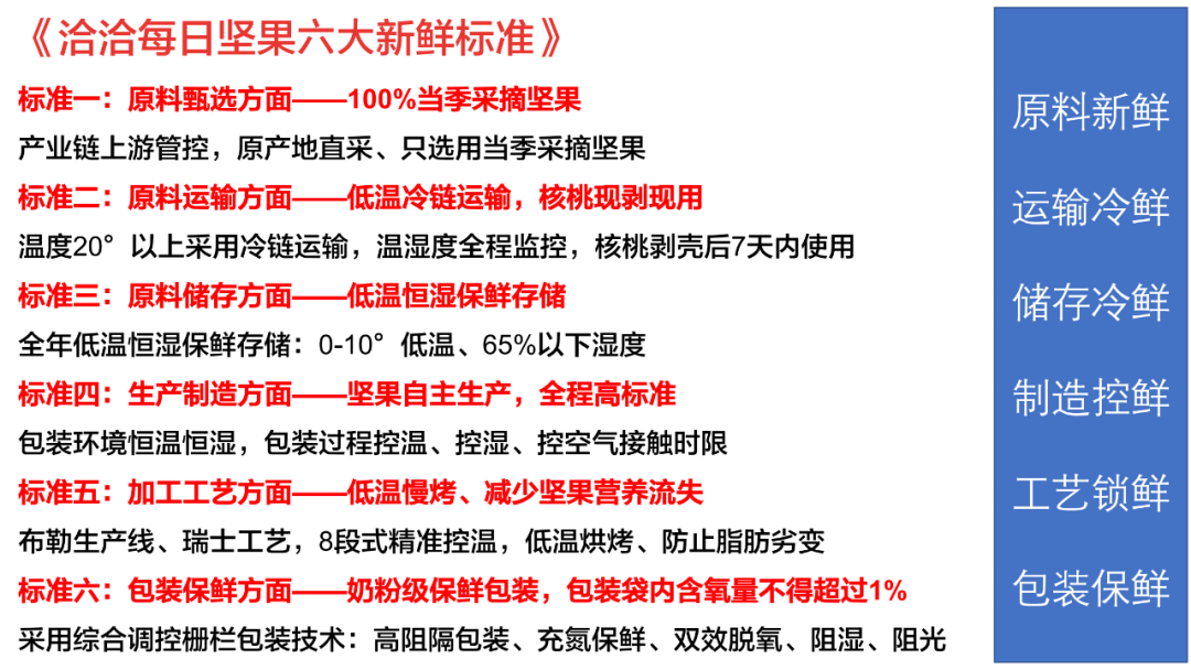 11月12日,洽洽坚果保鲜标准大会在上海召开,现场通过新华网抖音直播。大会上,洽洽首次提出每日坚果6大新鲜标准,同时连同全产业链企业代表,宣布成立洽洽全球坚果保鲜产业链联盟,不仅意味着行业首个新鲜标准的出炉,也标志着洽洽坚果近几年来举全力推进的“新鲜质造战略”又迈出坚实一步。2011年深交所上市后,洽洽就始终致力于产品线的延伸与扩展,特别是日渐升温的坚果食品。在新零售浪潮冲击下,传统零食品牌面临挑战,但洽洽仍然保持了令竞争对手羡慕不已的高利润率,关键原因在于其特有的全产业链模式,对各个环节的牢固掌控,保证高品质的同时,将运营风险将至最低。洽洽食品是目前唯一集种植、生产、销售于一身的零食大品牌,产业链的完整是其最大优势。依靠敏锐的市场洞察力,洽洽从2017年起重磅打造“每日坚果”。依靠对新鲜度的极致追求,带给消费者的高端体验,每日坚果对公司的贡献度逐年提升:从2017年的2.47亿元,营收占比6.86%,提高到2019年的8.25亿元,营收占比17.06%。在每日坚果的带动下,洽洽在坚果炒货市场中稳居前三。2014年,洽洽树立坚果发展战略之初,就将领“鲜”视作重要战略举措。凭借着对完整坚果产业链的控制,洽洽每日坚果得以实施多重保鲜-锁鲜技术:包括在国家优质坚果原产地100%当季采摘;快速入库冷藏;与全球工业干燥&烘烤领域的领军企业布勒合作,对低温慢烤全程进行精准和智能化控制;采用充氮+吸氧双重阻氧包装等。布勒集团亚太区总裁王维波在发布会上分享坚果智能制造及数字产业链。图片来源:洽洽在洽洽倡导的“新鲜质造战略”中,“质造”是核心。“质造”不仅仅是在原料、工艺等维度上的严谨与用心,更包含了对全产业链的整合和把控。据洽洽首席增长官王斌介绍:“每一包洽洽小黄袋为保障新鲜,要历经237项检测”。从原料采购、物流运输、生产制造、包装加工、市场分销等全产业链环节,洽洽围绕“鲜”制定严苛标准。其中,洽洽每日坚果以16道新鲜监控保障一路领“鲜”,从100%采摘当季原料,到全程冷链运输,到大数据监控烘焙温度等,层层新鲜质造。这些举措为洽洽树立“新鲜”、“质造”的品牌形象打下坚实基础。在多年“保鲜”实践基础上,洽洽此次携手多家重量级合作伙伴,发布零食行业首个坚果新鲜标准,是对洽洽多年高品质生产经验的一次浓缩与升华。