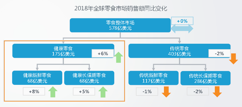 根据SPINS的统计数据,截至2018年4月,全球零食市场总额达578亿美元,其中新鲜零食为68亿美元,较上一年增长8%。中国的势头同样喜人。据京东大数据研究院和南都消费研究所联合发布的《食力消费趋势年度报告》称:2018年国内主打新鲜概念的休闲零食销量同比增幅超200%,年轻消费者对于线上购买新鲜食品的热情正在快速攀升。