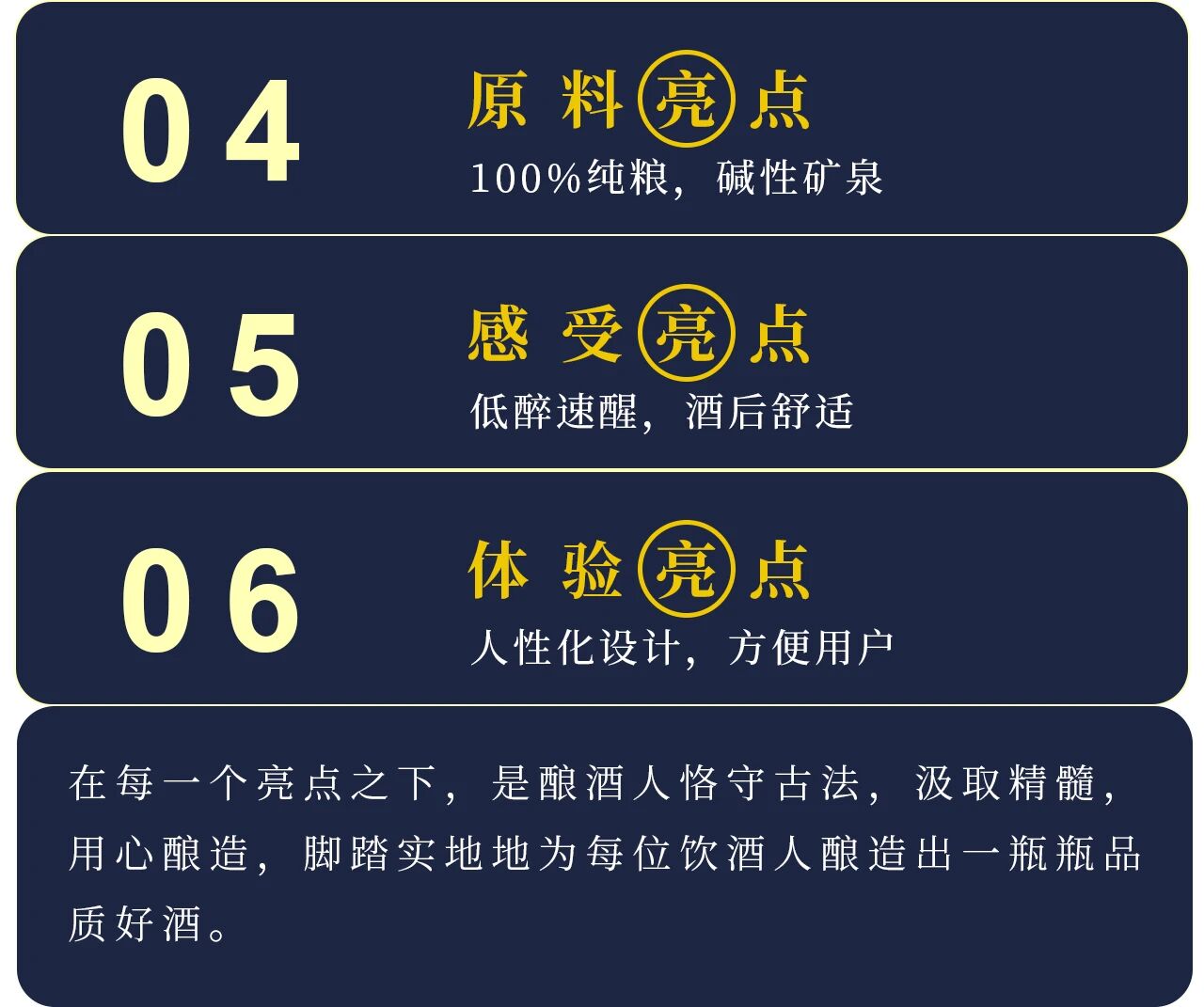 高透明玻璃加玻璃开模材质,让产品富有手感,以及光亚对比材质,让瓶子更有层次,产品背面更有文化内容背书,让产品更有内涵。