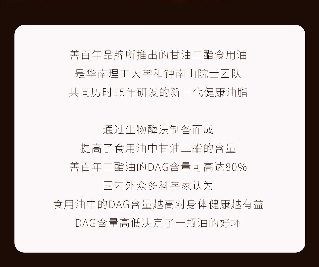 导读:善百年品牌所推出的甘油二酯食用油是华南理工大学和钟南山院士团队共同历时15年研发的新一代健康油脂。