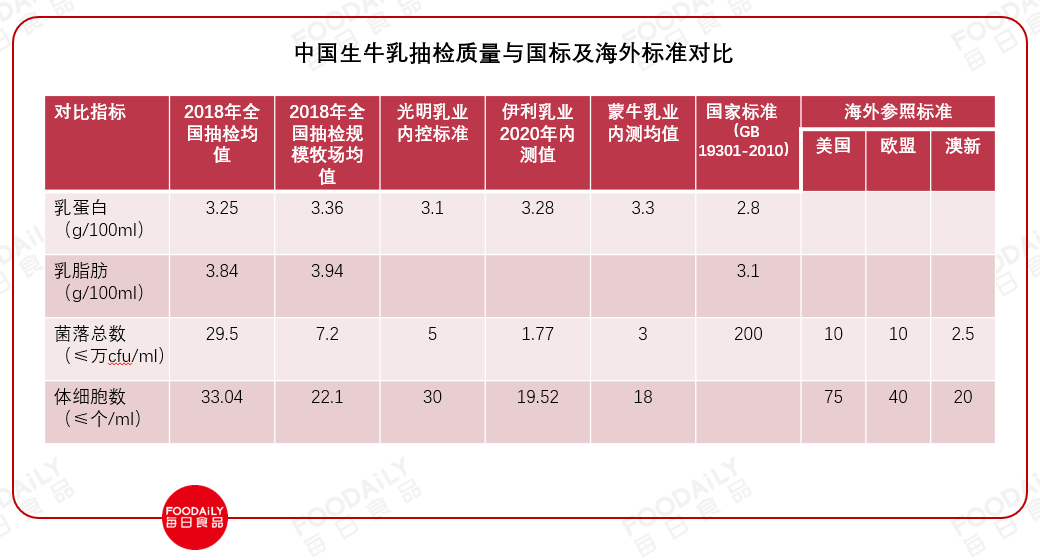 牵动亿万消费者神经的原奶质量也较以往有了明显改善。2018年国家生鲜乳抽检结果[2]显示:规模牧场的生乳质量不仅全面超越国标,而且也优于美国和欧盟;三大领军乳企的内控卫生标准(内测值),已经基本接近全球最优的澳新标准[3]。