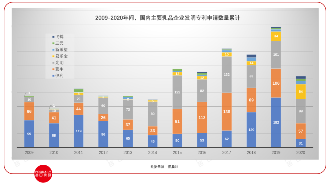 领军型乳企在激烈的市场搏杀中,充分意识到自主知识产权技术对企业竞争力的重要性,不断加大研发投入。过滤和杀菌工艺、自有菌株开发、母乳活性成分研究、工艺型/功能型乳基原料等领域都成为行业研发焦点。伊利作为国内乳企领头羊,在荷兰、新西兰等地打造多个创新中心,构建“全球智慧链”;耕耘19年建成中国企业首个“母乳研究数据库”。截至2019年底,伊利全球专利申请总数、发明申请总量已位列世界乳业第三。