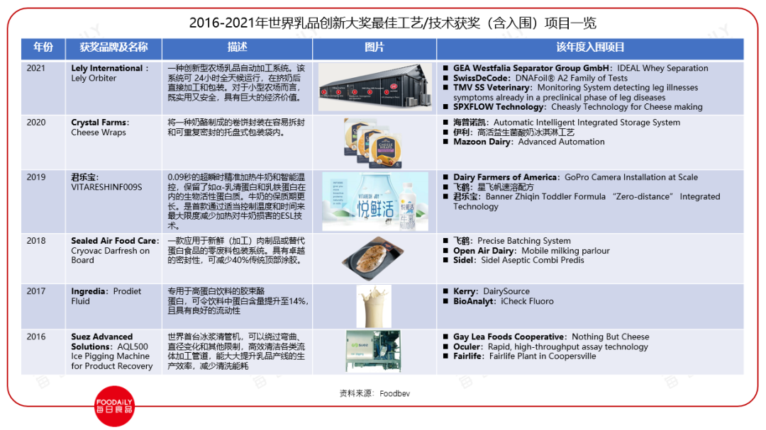 将过往6届工艺技术类大奖的获奖(含入围)项目列出,我们可以发现:绝大多数乳业创新技术围绕改善生产加工效率、减少能耗、提升可持续性而设计。2019年首次在该奖项上摘冠的君乐宝成为中国乳企技术创新的又一个标杆,其开发的INF009S技术,通过0.09秒超瞬时精准加热牛奶和智能温控,更多保留α-乳清蛋白和乳铁蛋白等活性物质,将鲜奶保质期延长至19天,为其实现跨区域销售提供了技术保障。时至今日,INF009S已经成为改写中国白奶市场格局的底层技术。