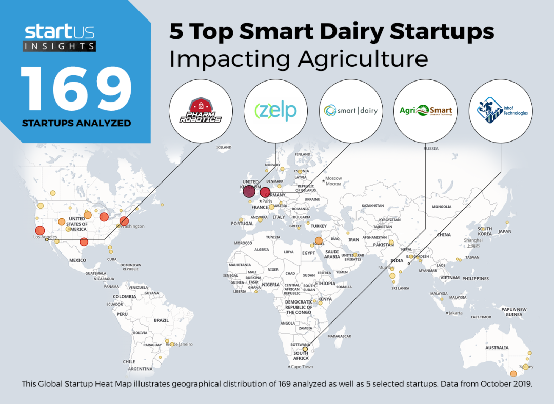 总部位于奥地利的数据科学公司StartUs Insights,以对于全球科技领域进展,尤其是初创型企业的跟踪汇总而闻名。2020年,该公司发布了对全球169家乳业相关初创公司的统计图。其中被作为范例列出的5家“样板”企业分别为:跟踪检测氧化甲烷排放的家畜可穿戴设备(英国Zelp)、建立在位置跟踪技术和综合健康监测技术之上的家畜ID 标签(南非AgriSmart)、用于管理家畜常规药物和疫苗注射的自动化机器人系统(美国Pharm Robotics)、基于大数据和AI技术的牧场挤奶分析平台(印度INHOF)、优化小型牧场自动化管理效率的组合工具(荷兰Smart Dairy Inside)。