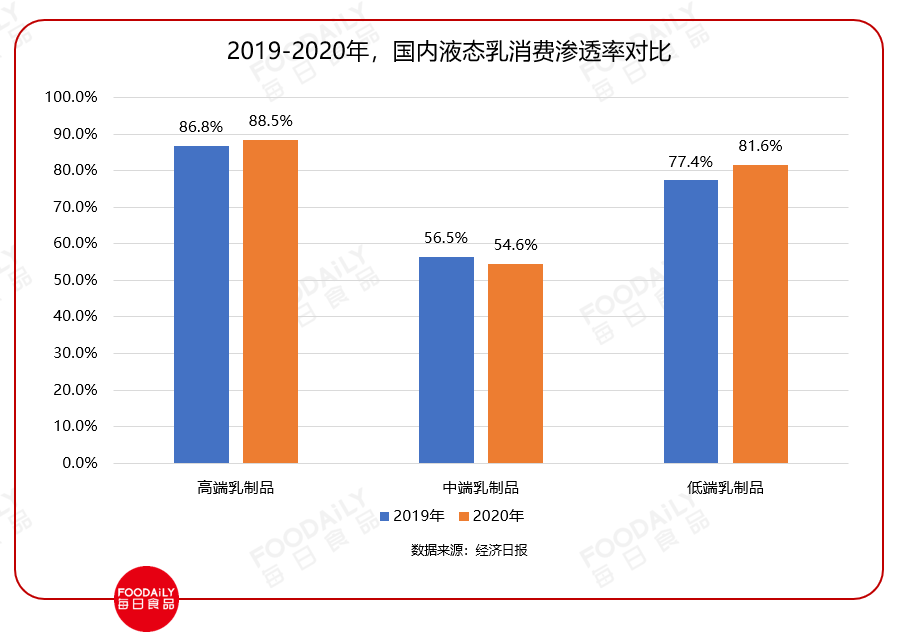 2020年底,凯度消费者指数抽样调查中国城市家庭的乳品消费状况[16],全面反映出当前各类产品的渗透率。其中,最引人关注的三项指标——高端(高端白奶、常温酸奶)、中端(高端功能奶、儿童液态奶、早餐奶和普通调味乳)、低端(基础功能奶和基础白奶)乳制品的渗透率分别为88.5%、54.6%和81.6%。较2019年平均提升1.3个百分点。