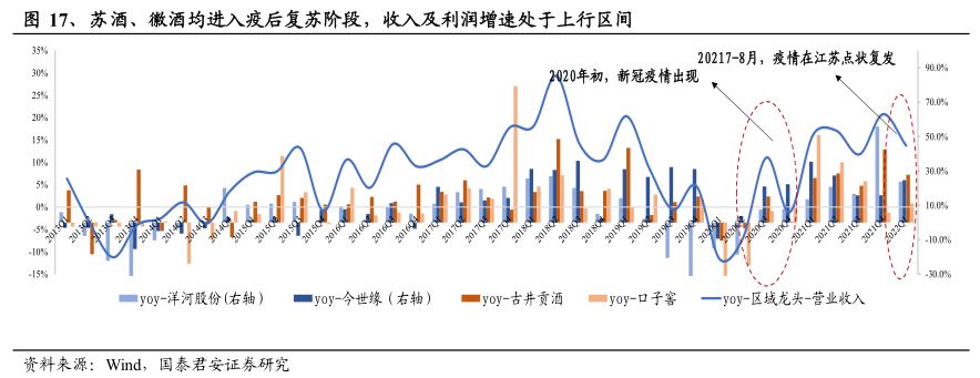 在《区域酒复苏逻辑再梳理》中,国泰君安从确定性角度出发,认为区域龙头酒企将引来较好收益。研究团队认为,疫情扰动常态化下,区域酒恢复性增长及结构抬升持续,业绩改善趋势明确,确定性维度下继续看好区域酒相对收益。
