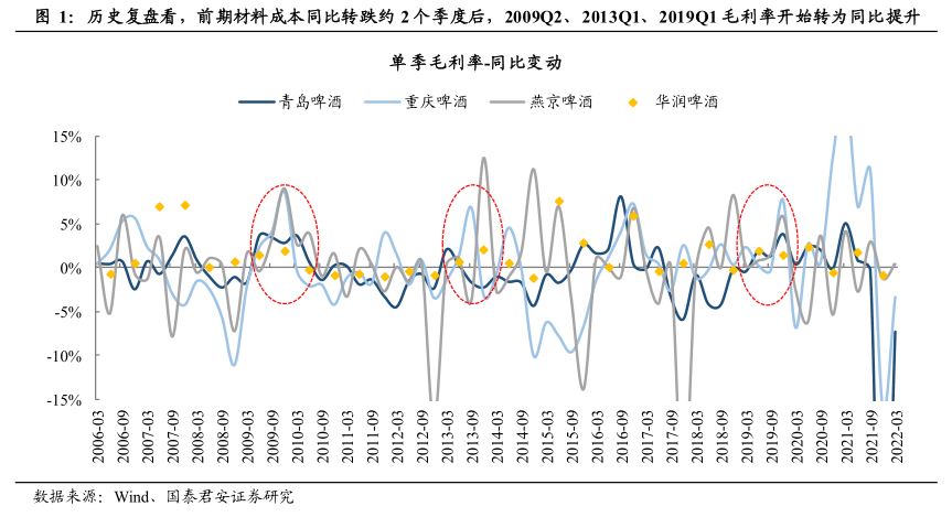 通过对2007-08、2011-12、2017-18 年,三轮成本涨跌的研究,研究团队发现,成本上涨之后均出现回落,对啤酒公司后续毛利率回升具有贡献。根据复盘,从主要原料包材单季度的市场价同比由涨转跌,到公司报表端毛利率提升,约滞后2个季度。由此,本轮成本前期涨幅较大,后期改善弹性有望更明显。