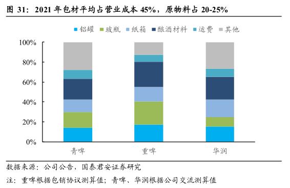目前,合计占啤酒营业成本约45%的包材价格已同比转跌,玻璃价格22Q1同比涨幅缩至1%、22Q2同比降25%;铝价22Q2同比涨幅环比收窄26pct至11%、7月中上旬同比转跌5%;瓦楞纸价格22Q1同比+3%、22Q2同比降3%。综上研究团队预计22Q2-Q3为包材市场价由涨转跌的转折点,结合历史复盘及采购周期,预计22Q4至23Q1,包材成本下行对盈利的贡献将逐步在报表端有相对明显的体现。