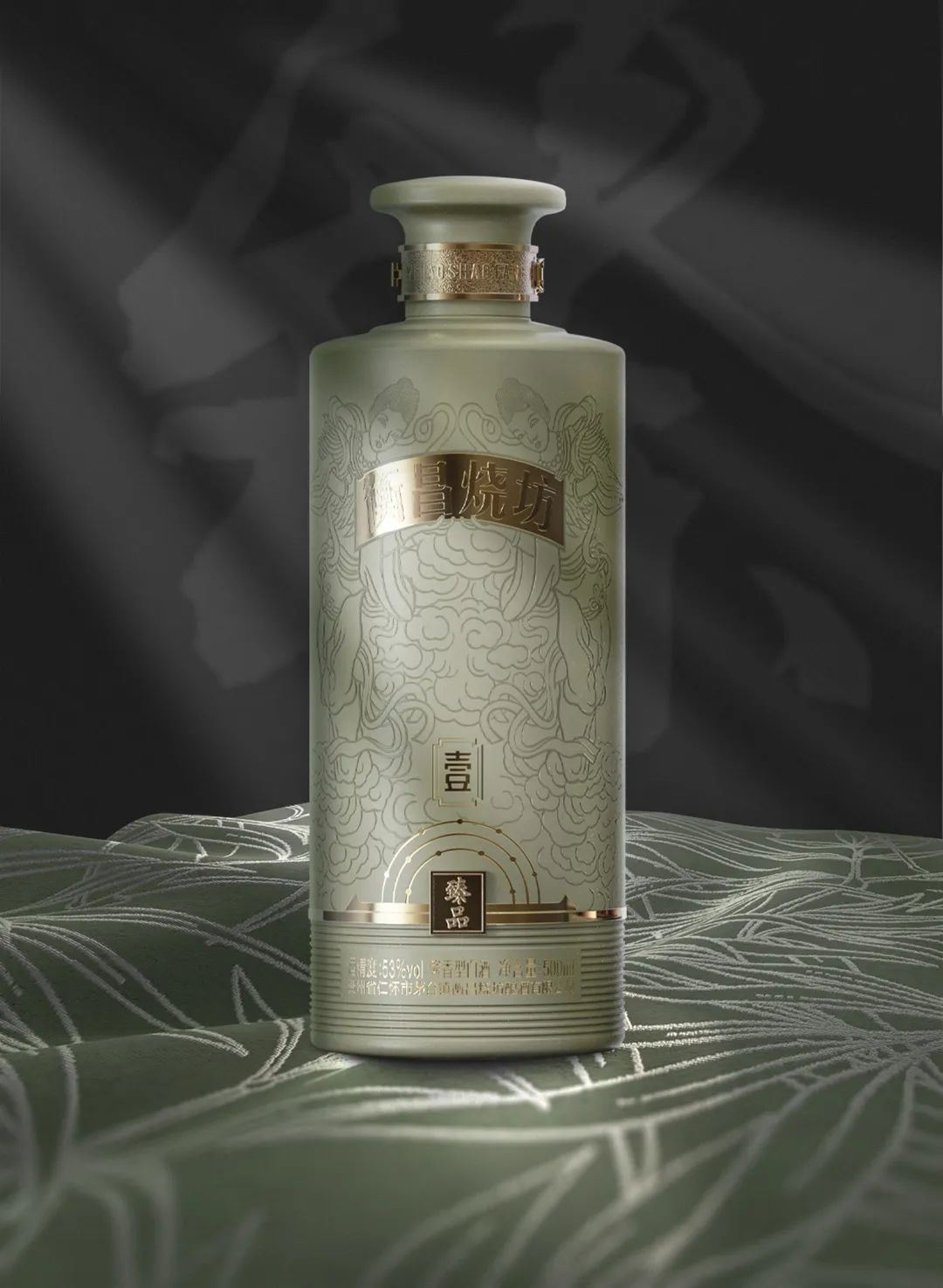 怀酒?经典运用了《千里江山图》的元素,青绿山水勾勒出大好河山,与怀酒的品牌内涵相符合。酒瓶肩部抽象的金色水纹既象征着孕育酱香白酒的赤水河,也符合中国人“以水为财”的传统寓意。瓶体似坐拥一个元宝,前后山水相连,寓意吉祥连绵不绝。