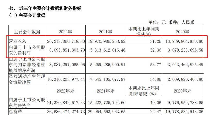 报告显示,2022 年,公司围绕“全面推动汾酒高质量发展,又好又快地扎根中国酒业第一方阵”的复兴目标,坚持高站位谋划部署,高标准组织推进,高效能联动协作,改革成果全面巩固、市场拓展成效显著、基础管理持续夯实,主要经营指标再创历史新高,全年实现营业总收入 262.14 亿元,同比增长 31.26%;归属于上市公司股东的净利润 80.96 亿元,同比增长 52.36%。